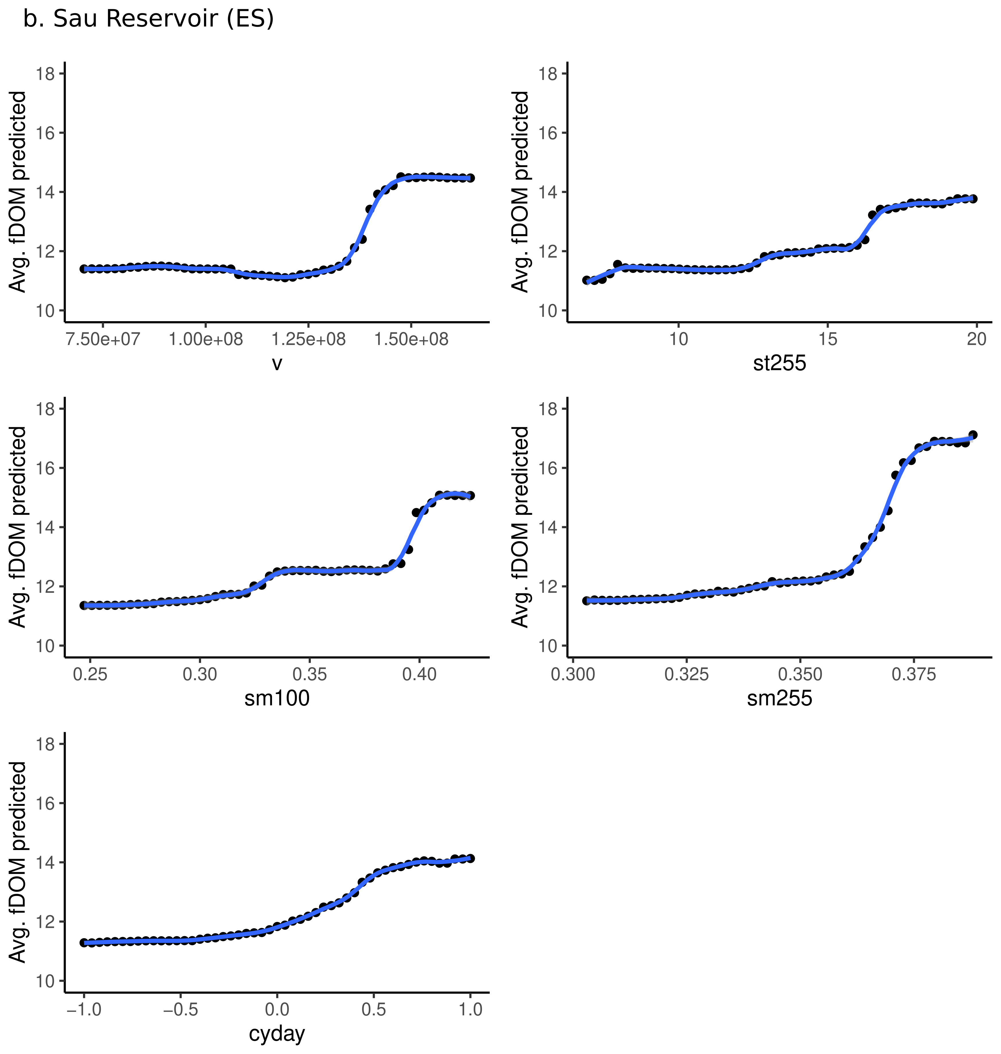 Our results suggest high potential for scalability, as predictive performance remained consistent across different driver sets even for two contrasting study sites, and performed good using only reanalysis data that is globally available and Julian day (Fig. 5). Importantly, this consistency remained even when specific highly-influential drivers were removed from the driver set. For instance, in Sau, where human intervention makes future reservoir outflows difficult to predict, avoiding reliance on water volume as a driver proved advantageous, as its removal from the set of drivers maintained model performance, despite being identified as an influential variable. It is likely that soil moisture at the deepest layer, a variable that showed a behavior similar to that of volume (Fig. 4), may have contributed to maintain the predictive performance when volume is removed from the driver set. In addition, for Feeagh, the predictive capacity was also maintained when using only meteorological and soil drivers. This demonstrates that a large driver dataset, such as the 24-variable set used in this study, would not be necessary to produce an accurate prediction when modelling fDOM using supervised machine learning.