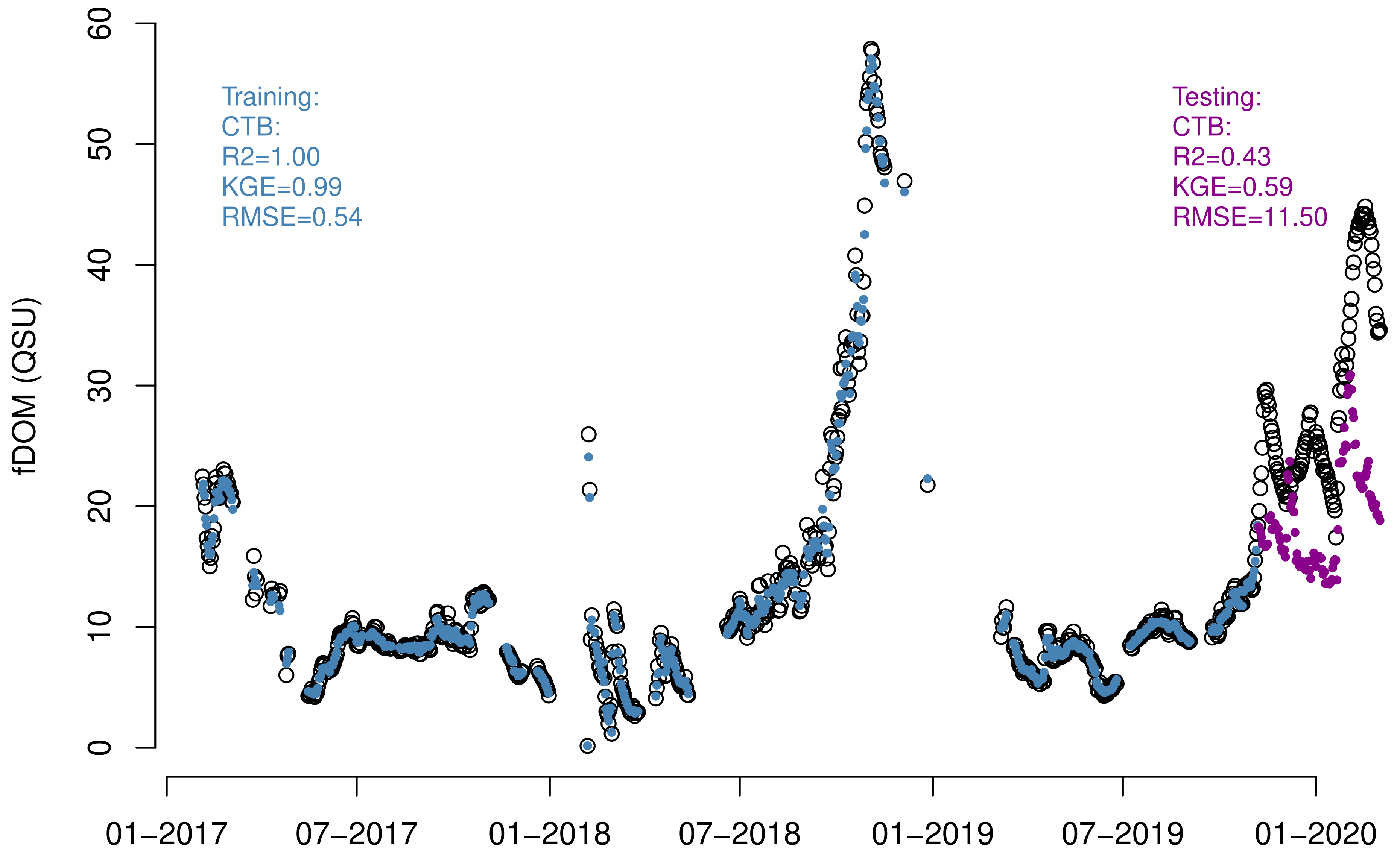 Supervised ML models have advantages and limitations for time series prediction. In addition to capturing non-linear relationships typical in aquatic systems and water quality predictions (Hollister et al., 2016; Regier et al., 2023), they provide flexibility to assess multiple drivers, temporal indicators, and variables external to the system (Qi, 2012; Rodriguez-Galiano et al., 2015). ML models do not require a fixed set of drivers to predict fDOM effectively, unlike process-based models, which typically rely on predefined inputs. Additionally, there is no need for parameter calibration but hyperparameter tuning, simplifying the modelling process. While some may argue that the lack of parameterization suggests a “black box” approach, supervised ML can provide insights into the potential drivers for predicting a target variable (Biau and Scornet, 2016; Molnar, 2020).