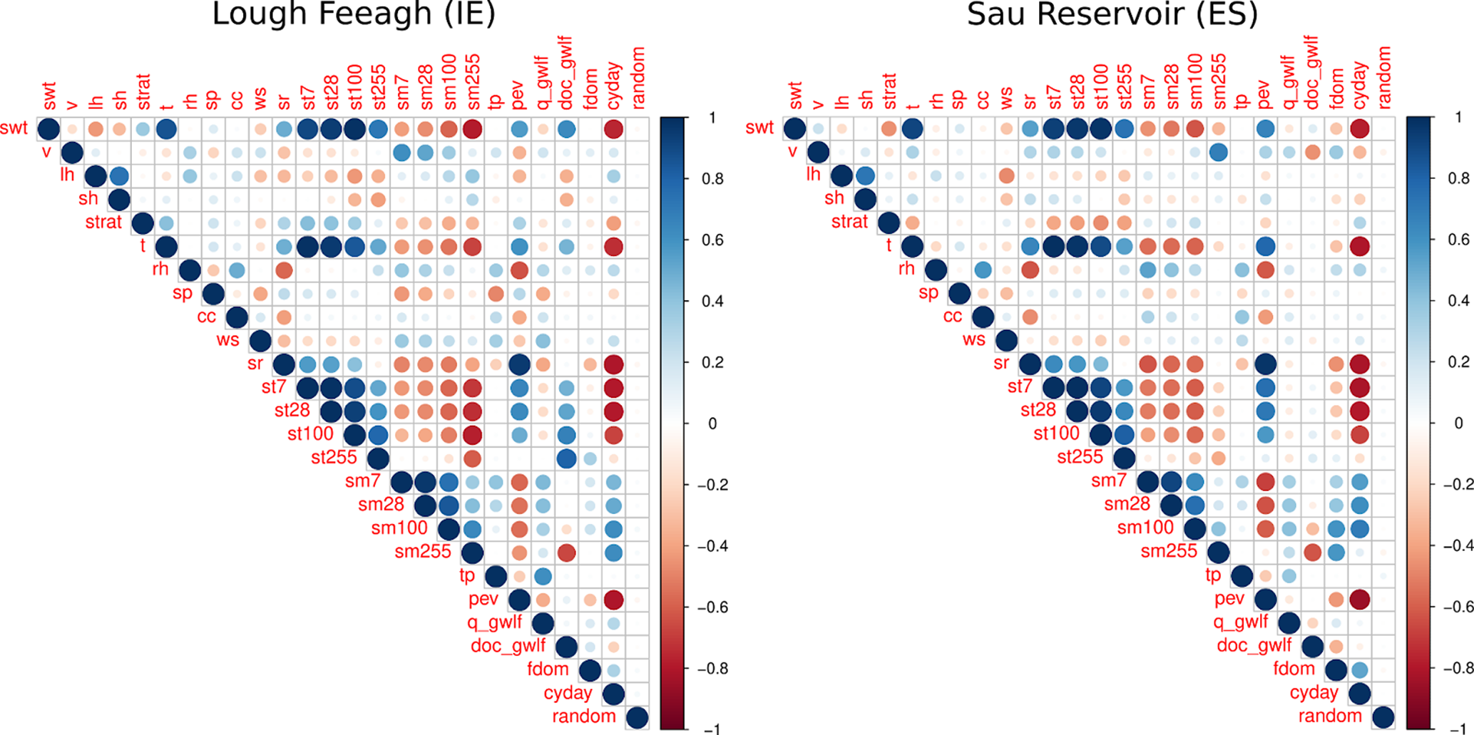 Daily time series of 5 key lake variables (see Fig. 2) were obtained from the General Lake Model (GLM) run for each site. GLM is an open-source, one-dimensional hydrodynamic model designed to simulate the vertical stratification and water balance of lakes and reservoirs. It calculates vertical profiles of temperature, and density by accounting for factors such as inflows and outflows, mixing processes, and surface heating and cooling (Hipsey et al., 2019). GLM was calibrated and validated by evaluating the fit of modelled water temperature against measured water temperature profile data in Feeagh (2010–2015 and 2016–2017, respectively) and Sau (1997–2007 and 2008–2018, respectively). The calibration strategy was based on previous lake modelling deployments at each site (Mercado-Bettín et al., 2021; Paíz et al., 2025b). Model performance was satisfactory for both sites.