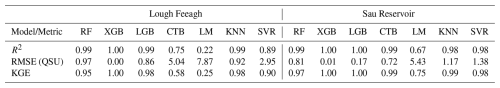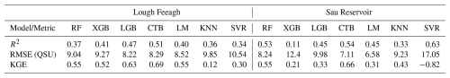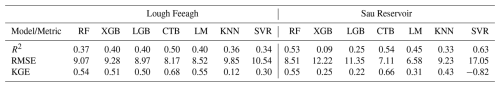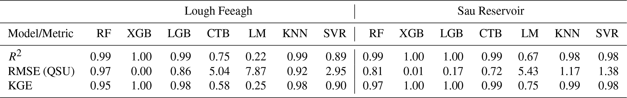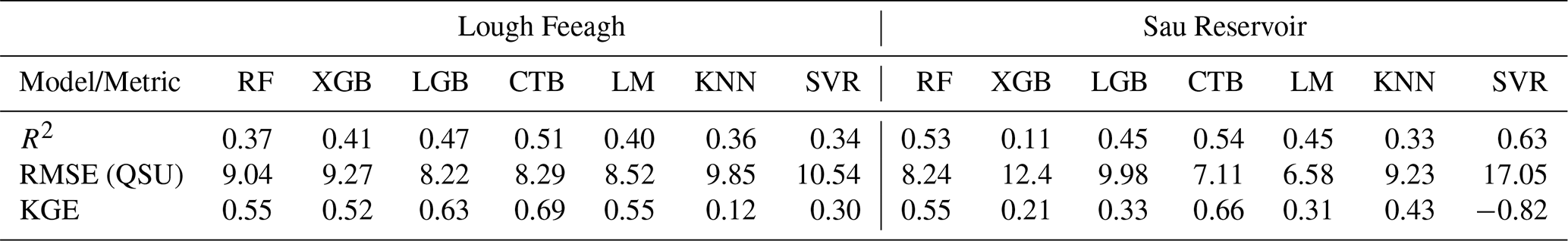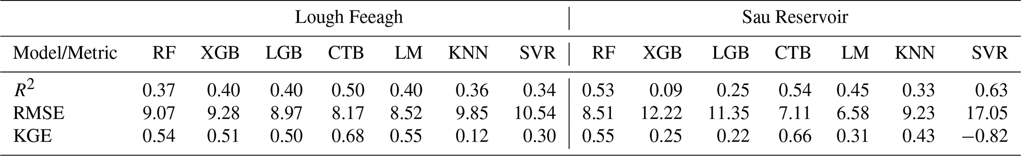 The results during the training phase (Table A2) confirm that most ML models, especially XGB, RF, and KNN, had a high performance during training. However, the performance dropped in some models (e.g., XGB at Sau Reservoir) during the testing phases, underscoring the importance of evaluating models on independent test data to assess generalisability and overfitting. CatBoost (CTB), again, presented a more stable performance, showing slightly lower training metrics (especially in Feeagh) compared with the other ML models and better generalisation when comparing with the metrics during testing. Feeagh exhibited more consistent model performance, with less overfitting between training and testing phases, across the different validation methods (Fig. A7), compared to Sau. This difference is likely attributable to the limited amount of available data at Sau. In addition, we assess whether this overfitting could be related to the moderate skewness of the fDOM data in Sau, however similar results and performance metrics were found when applying log transformation (to remove skewness) before applying the ML models (see Fig. A11 and Tables A3 and A4).