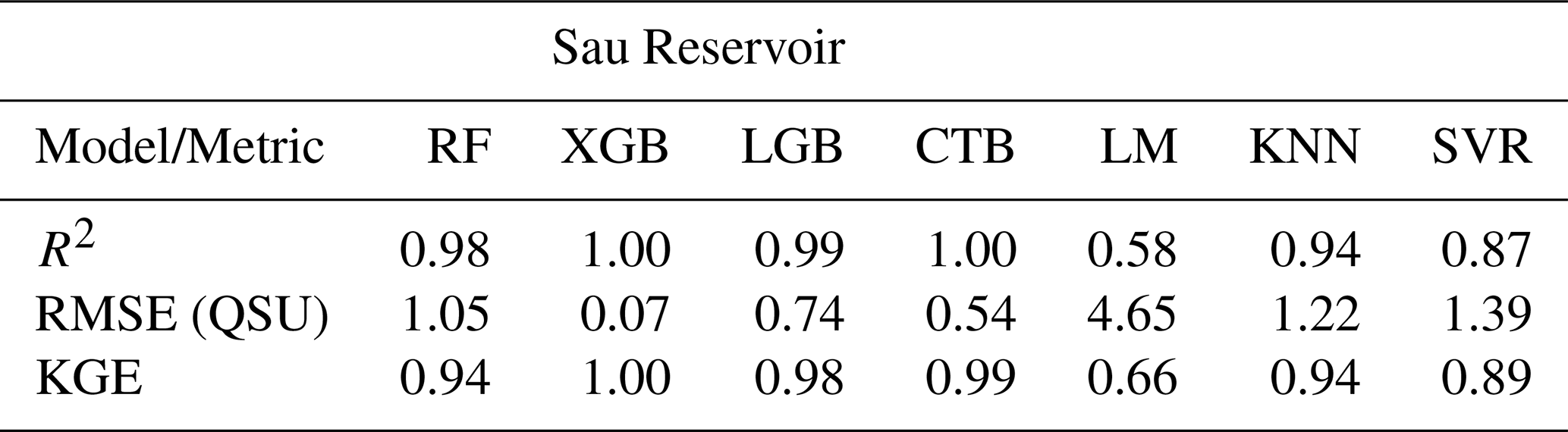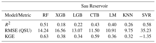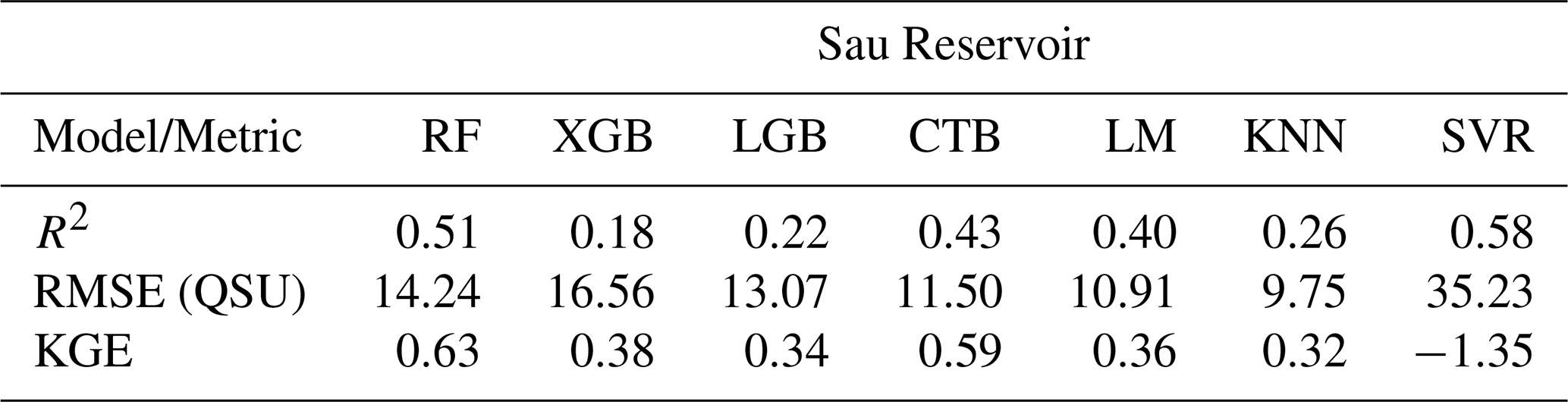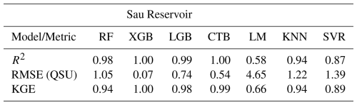 Table A4Model comparison during training to predict fDOM using the most influential drivers in Sau with previous application of log10 transformation. Statistic metrics (R2, RMSE and KGE) were calculated to compare the performance of the models Random Forest (RF), eXtreme Gradient Boosting (XGBoost), Light Gradient Boosting (LGB), Catboosting (CTB), k-Nearest Neighbors (KNN), Support Vector Regression (SVR) and linear model during training period.
