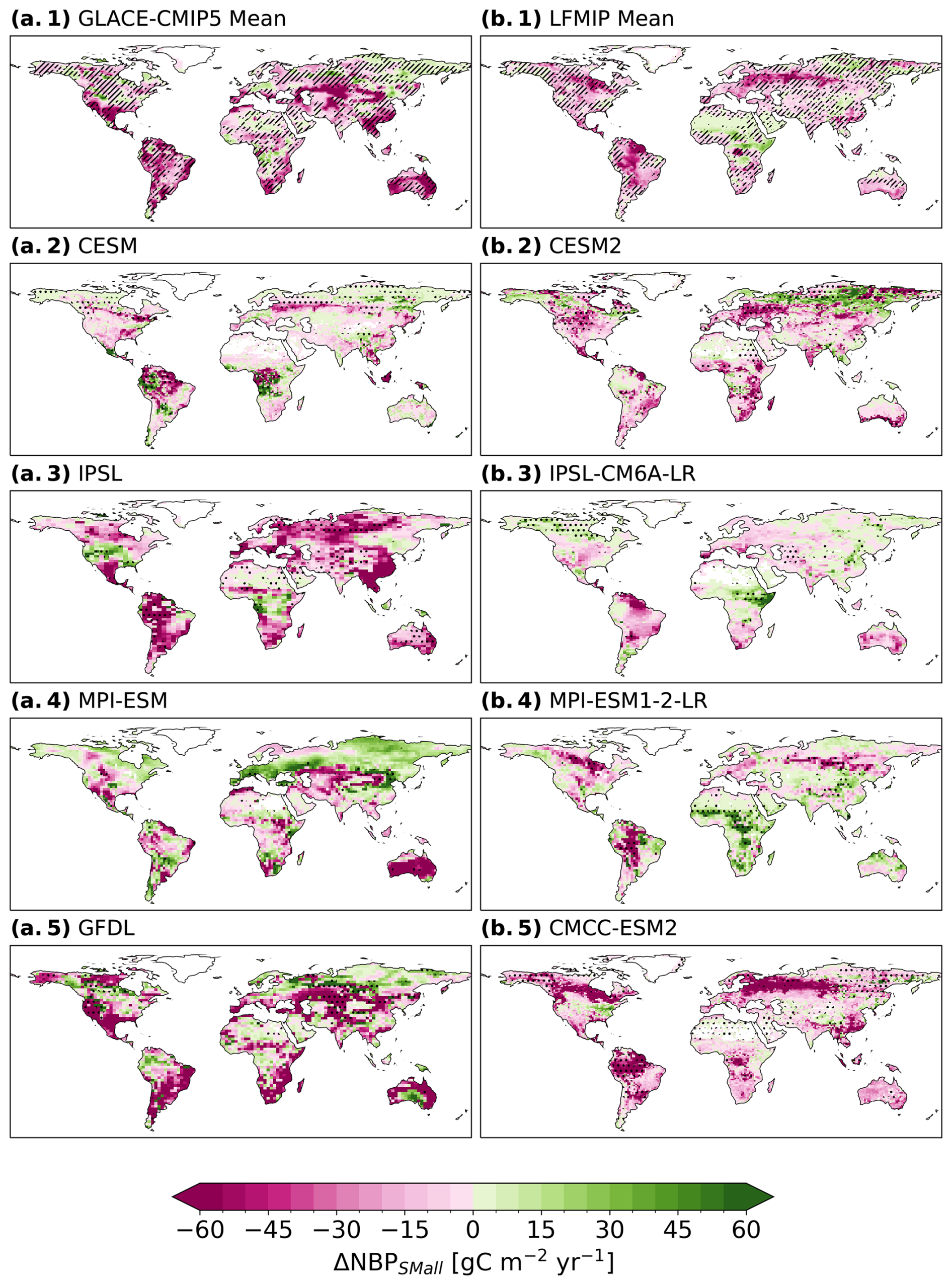Figure 2Changes in NBP due to the total SM effect (ΔNBPSMall) for the future period (2070–2099) for (a.1) the GLACE-CMIP5 mean, (b.1) the LFMIP mean, (a.2–5) individual model projections of GLACE-CMIP5, and (b.2–5) individual model projections of LFMIP. Pink indicates a reduction and green an increase of NBP due to SM. White indicates no data. In (a.1) and (b.1) hatching indicates less than 75 % agreement in the sign of change across models for the future period relative to the baseline period. In (a.2–5) and (b.2–5) stippling indicates areas where ΔNBPSMall for the future period differs significantly from the baseline period at the 5 % level (two-sided Welch's t-test).