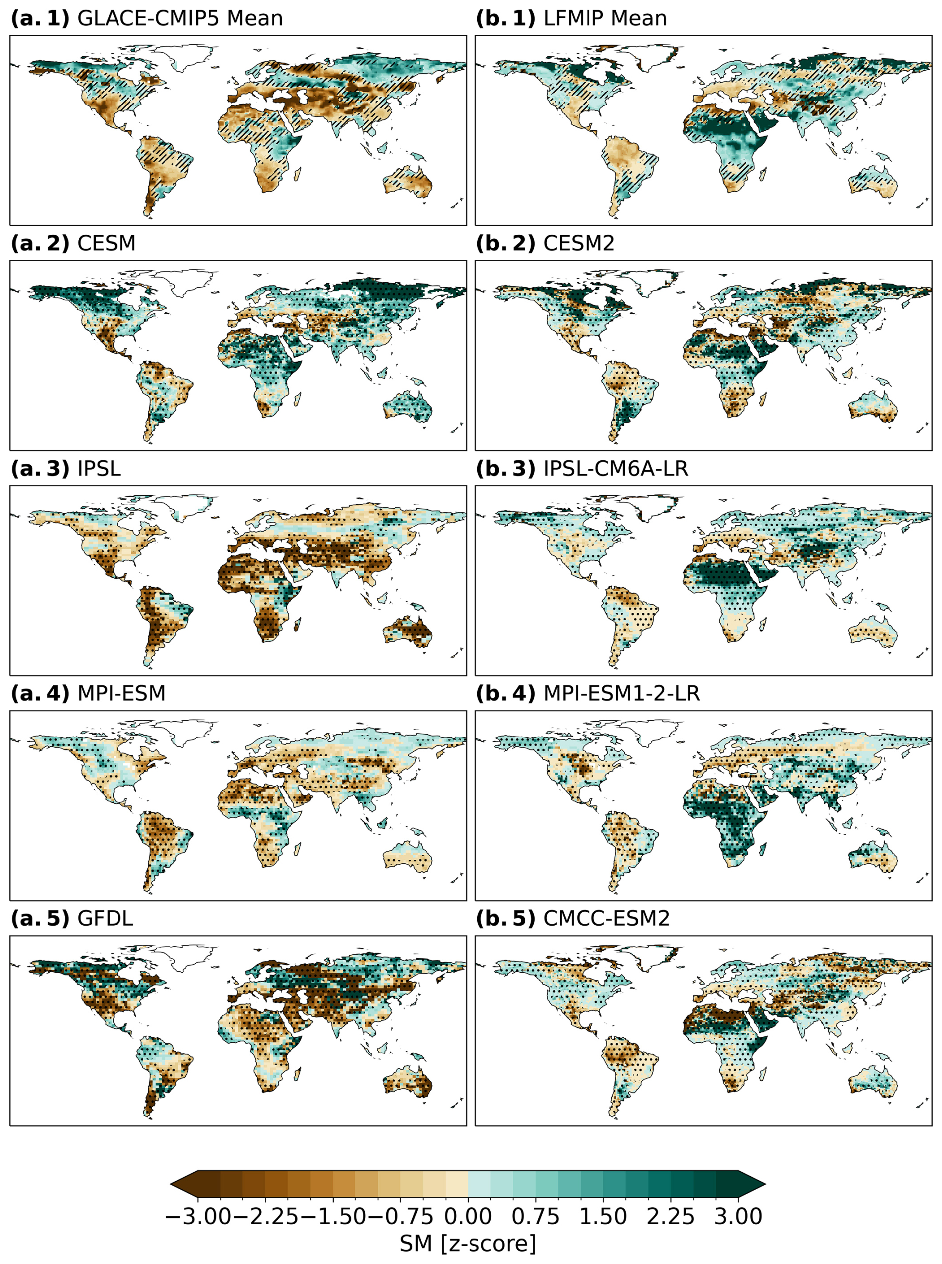 Figure 3SM changes in standard deviations (z-score) from the control simulation for the future period (2070–2099) relative to the baseline period (1981–2010) for (a.1) the GLACE-CMIP5 mean, (b.1) the LFMIP mean, (a.2–5) individual model projections of GLACE-CMIP5, and (b.2–5) individual model projections of LFMIP. Brown indicates drying and green wetting relative to the pre-industrial period. White indicates no data. In (a.1) and (b.1) hatching indicates less than 75 % agreement in the sign of change across models for the future period relative to the baseline period. In (a.2–5) and (b.2–5) stippling indicates areas where changes in SM for the future period differ significantly from the baseline period at the 5 % level (two-sided Welch's t-test).