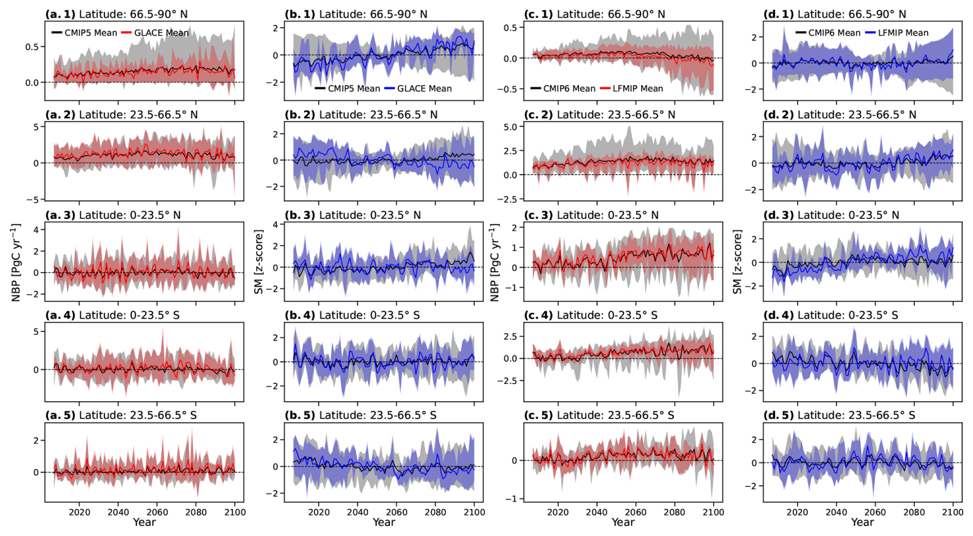 Figure 4Comparison of NBP and SM of (a, b) GLACE-CMIP5 to the CMIP5 multi-model mean (MMM) and (c, d) LFMIP to the CMIP6 MMM within latitude zones from north (1) to south (5). In columns (a) and (c), red lines show NBP by latitude zone and red shading the 95 % confidence interval for GLACE-CMIP5 and LFMIP, respectively. In Columns (b) and (d), blue lines show SM by latitude zone and blue shadings the 95 % confidence interval. Black lines indicate the full ensemble MMM and grey shadings the 95 % confidence interval.