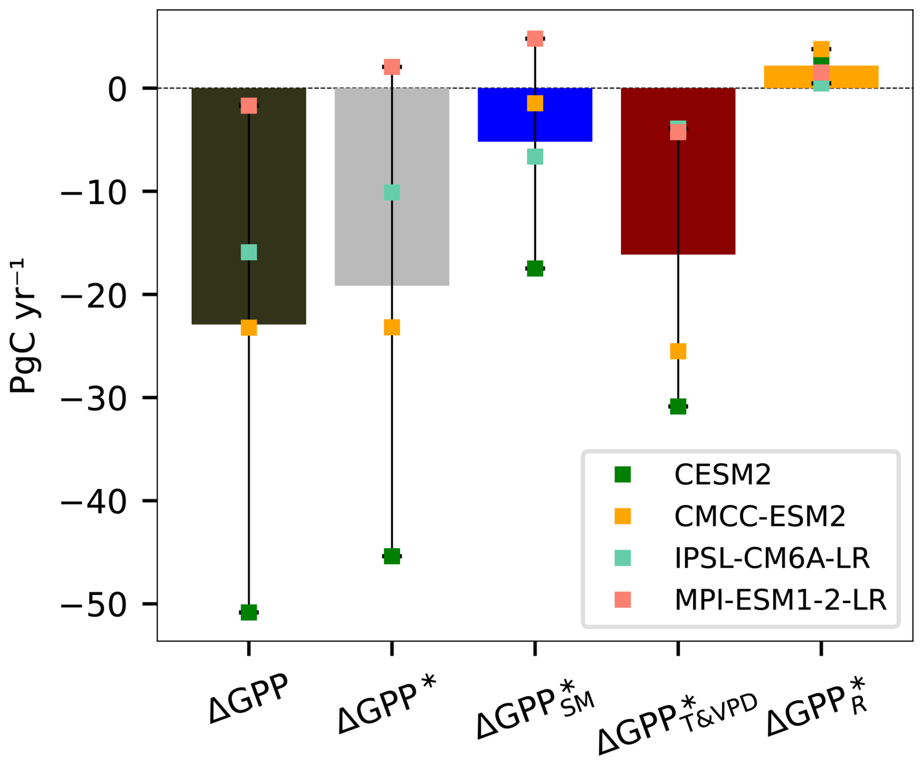 Figure 5Global changes in GPP due to the total SM effect modelled in LFMIP (ΔGPP, black bar). Contribution analysis estimates for LFMIP of the total global changes in GPP due to SM (ΔGPP*, grey bar) and individual contributions from the direct SM effect (, blue bar) and indirect SM effects via vapour pressure deficit and temperature (, red bar) and radiation (, yellow bar) for the future period (2070–2099). Bars show the LFMIP mean and coloured dots the individual models.