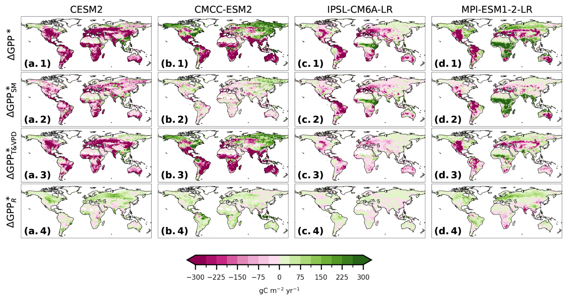 Figure 6Contribution analysis estimate for LFMIP of the total changes in GPP due to SM (ΔGPP*) and the individual contributions from the direct SM effect (), the indirect SM effects via VPD and T (), and via R () for the future period (2070–2099). Pink indicates a reduction and green an increase of NBP due to SM. White indicates no data.