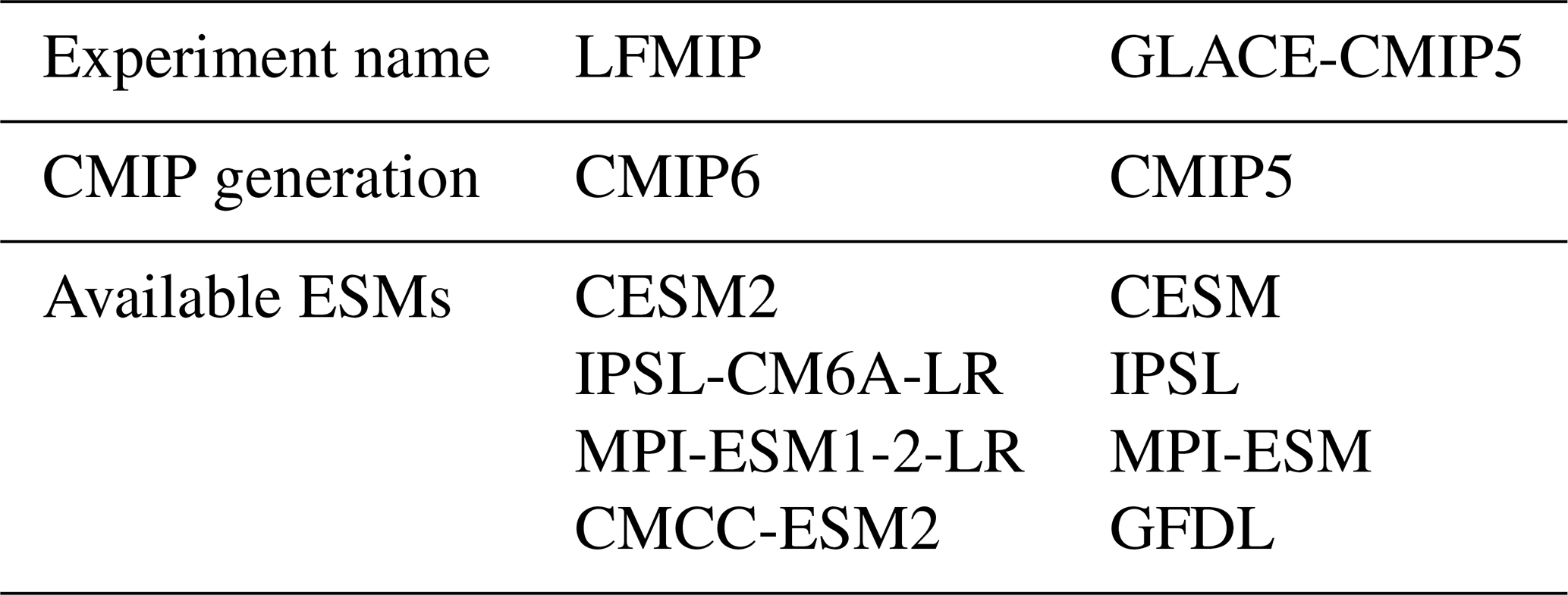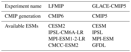 Table 1Overview on the model experiments LFMIP and GLACE-CMIP5 used in this analysis, including the respective CMIP generation and the available Earth System Models that provide the required output for the experiment simulations.