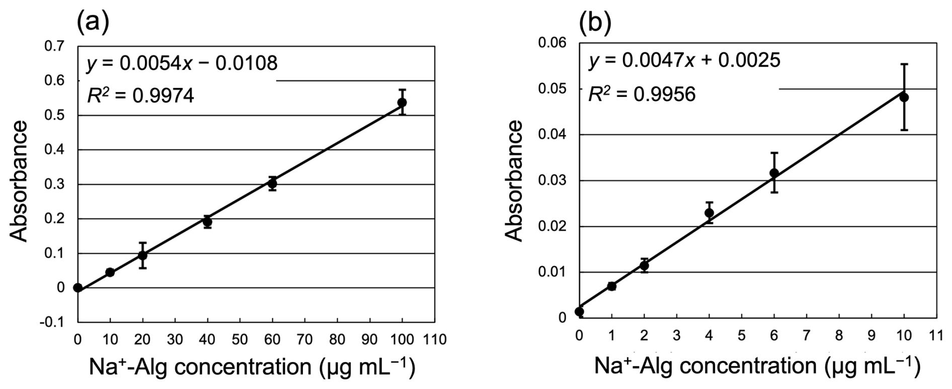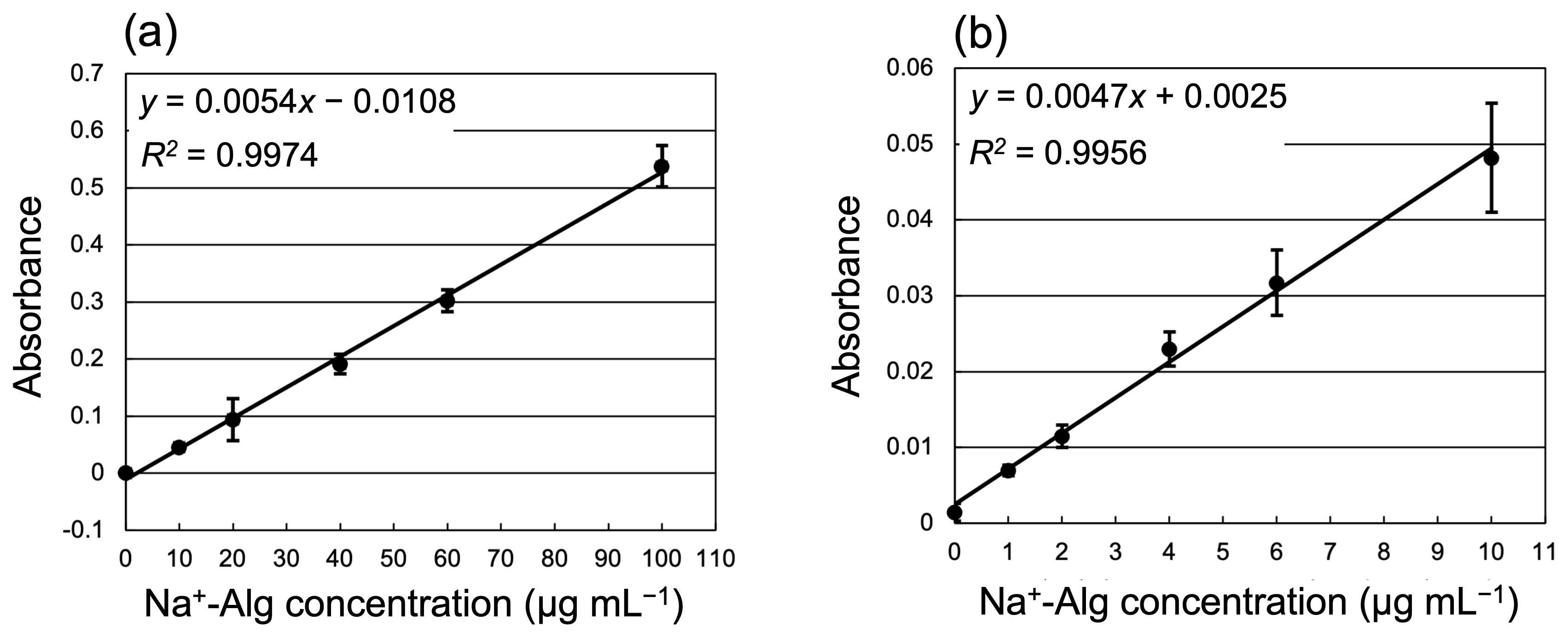 Standard solutions (0, 10, 20, 40, 60, and 100 µg mL−1) were freshly prepared for each analysis using a sodium alginate reagent (Na+-Alg, 500–600 cP, Wako, 1st grade) and Milli-Q water. A calibration curve for Na+-Alg (0–100 µg mL−1) is shown in Fig. 2a. The regression equation we obtained was “”. Several blank samples (Milli-Q water added with Reagents A and B) were also measured (n=5). We determined the lower limit of quantification as a sample absorbance equal to 10 times the standard deviation of the blank sample (SD = 0.00040, n=5), which corresponds to 0.0040 abs (= 10-fold SD) and 0.74 µg mL−1. To confirm the quantitative accuracy near the lower limit, a calibration curve for low concentrations of alginate (0, 1.0, 2.0, 4.0, 6.0, and 10 µg mL−1) was prepared (Fig. 2b). The regression equation for low concentrations was “”. The slopes of the calibration curve differed depending on the concentration range; thus, we used separate regression equations for the low (0–10 µg mL−1) and high (10–100 µg mL−1) concentration ranges.