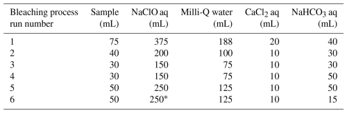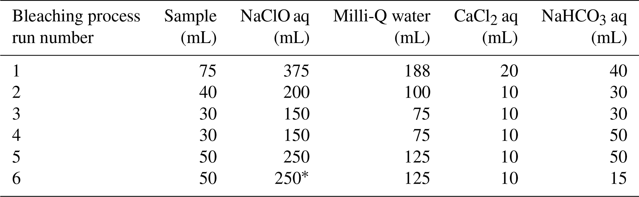 To prepare the buffer solution for adjusting pH and salinity, 1.0 mL of 1.0 mol L−1 Tris-HCl (pH 7.5, NIPPON GENE), 1.0 mL of 1.0 mol L−1 Tris-HCl (pH 8.0, NIPPON GENE), 3.0 mL of 5.0 mol L−1 sodium chloride (NaCl, Wako, purity ≥ 99.5 %) solution, and 5.0 mL of Milli-Q water were combined in a tube and thoroughly mixed. For the enzymatic reaction, 5.0 mL of Milli-Q water, 0.80 mL of the prepared buffer solution, 2.0 mL of the bleached extract solution, and 0.40 mL of alginate lyase (HULK) were sequentially added to a centrifuge tube with gentle mixing after each addition. This enzymatic degradation experiment was performed in triplicate using the same sample (n=3). In parallel, a control experiment was performed without the addition of alginate lyase. In this case, 5.0 mL of Milli-Q water, 0.80 mL of the prepared buffer solution, 2.0 mL of the bleached extract solution, and 0.40 mL of Milli-Q water instead of alginate lyase were sequentially added to a centrifuge tube with gentle mixing after each addition. The control experiment was also conducted in triplicate (n=3).