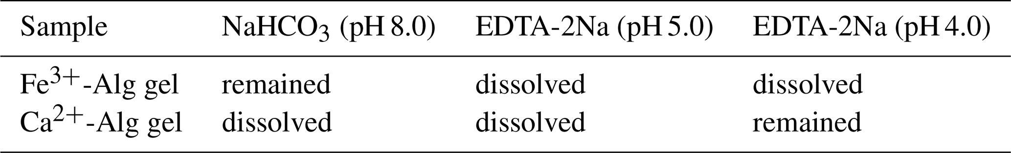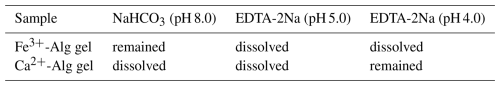 Fe3+-Alg gel was prepared by dropping 20 mL of 10 g L−1 Na+-Alg solution into 20 mL of 100 g L−1 iron (III) chloride hexahydrate (FeCl3, Wako, purity ≥ 99 %) solution in a beaker. To ensure complete reaction between Na+-Alg and Fe3+ ions, the resulting Fe3+-Alg Na+-Alg suspension was repeatedly filtered through a 100 µm stainless steel mesh using a silicone spatula. The reddish Fe3+-Alg gel retained on the mesh was collected and rinsed three times with Milli-Q water. For comparison, Ca2+-Alg gel was similarly prepared by dropping 20 mL of 10 g L−1 Na+-Alg solution into 20 mL of 100 g L−1 CaCl2 solution. Each gel type (Fe3+-Alg and Ca2+-Alg) was divided into two portions. One half of each was added to 500 mL of 10 g L−1 NaHCO3 solution and heated to 60 °C with continuous stirring for 1.5 h. The other halves were added to 500 mL of 80 g L−1 EDTA-2Na (Kanto Chemical, Tokyo, Japan, purity > 99.5 %) solution, which had an initial pH of 4.0, and stirred for 1.5 h. These suspensions were then kept overnight at room temperature. The presence or absence of remaining gel was assessed visually. Subsequently, the pH of the EDTA-2Na solution was adjusted to 5.0 by adding 3.0 mol L−1 NaOH solution. After stirring for an additional 1.5 h, the mixtures were again kept overnight at room temperature, and the presence of gel was assessed visually.