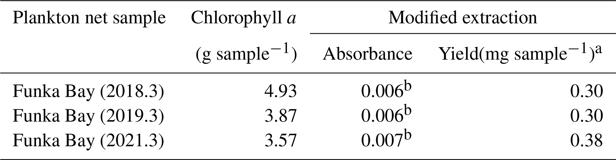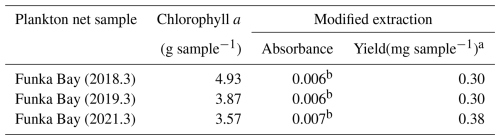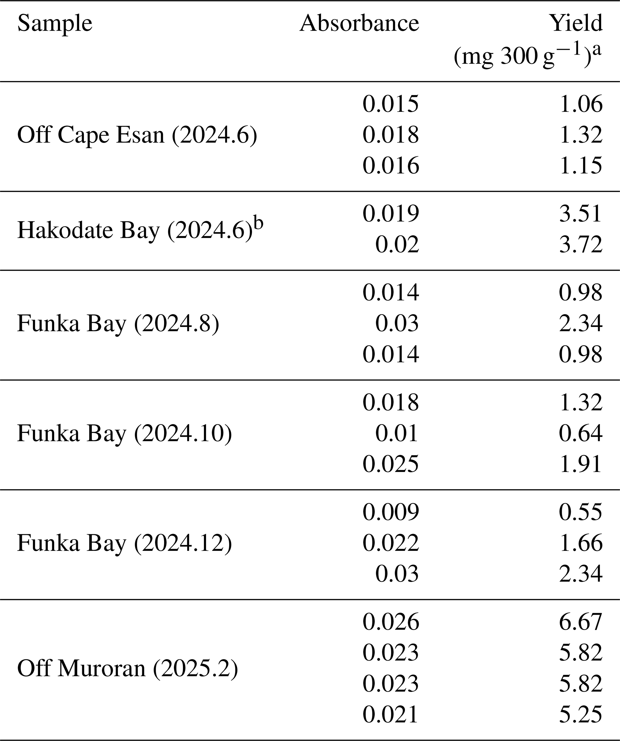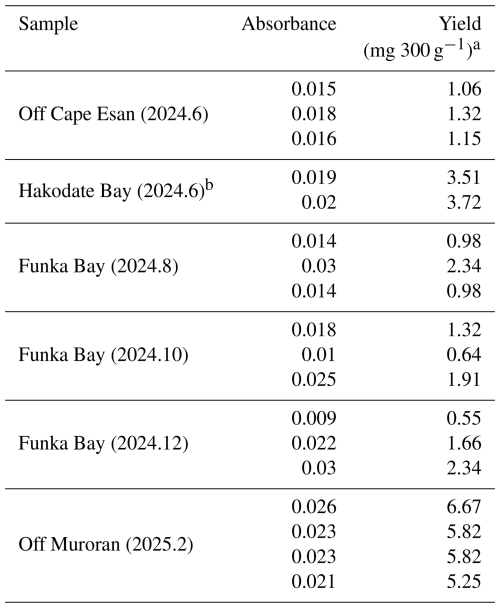 Phytoplankton aggregates were collected from the water column in Funka Bay (Hokkaido, Japan, Fig. 1) during the peak of the spring phytoplankton bloom in March of 2018, 2019, and 2021. Sampling was conducted using a plankton net with a mouth area of 707 cm2 (mesh size: 300 µm; mouth diameter: 30cm) towed from near the seafloor (87m depth) to the surface. During the bloom, the chlorophyll-a concentrations in the water reached approximately 20 µg L−1. It has been reported that approximately half of the annual primary production in Funka Bay occurs during the spring bloom, with a substantial portion of diatom aggregates sinking and being deposited on the seafloor (Kudo et al., 2000). We assumed that the amount of phytoplankton aggregates collected by the plankton net corresponded to the sedimented amount of polyuronic acids derived from phytoplankton on the seafloor surface within the same area (30cm diameter). The collected phytoplankton samples (n= 3) were processed using the modified extraction protocol (described in Sect. 3.2.3) and analyzed colorimetrically (as described in Sect. 2.2) to evaluate the detectability of polyuronic acids derived from the phytoplankton samples.
