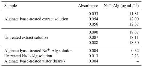 However, the extract solution retained relatively high Na+-Alg concentrations (11.81–12.37 µg mL−1) even after enzymatic treatment. This result suggests that the bleaching treatment was insufficient to completely remove polyphenols, which may have interfered with alginate lyase activity. In addition, the absorbance of the water sample treated with alginate lyase was 0.004, indicating that residual enzyme in the measurement sample contributed slightly to the colorimetric reading; however, this effect was considered negligible. Taken together, these findings indicate that the organic matter extracted from ocean sediments using the modified protocol contained alginate, accounting for at least 34 % of the detected uronic acids.