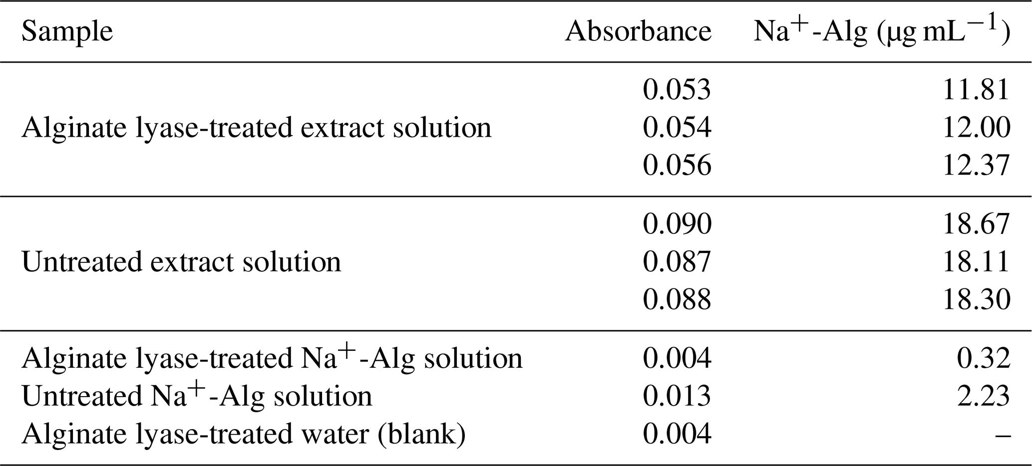 In Sect. 3.3, we demonstrated that a fraction of the uronic acids derived from phytoplankton remained after applying the modified extraction protocol. To confirm that the uronic acids present in the extract solution originated from alginate, we evaluated changes in uronic acid content following enzymatic degradation with alginate lyase.