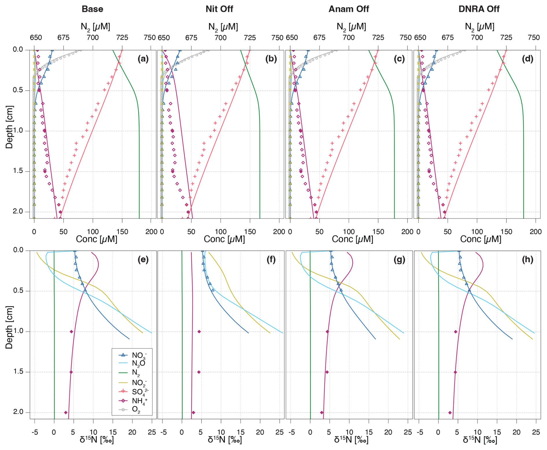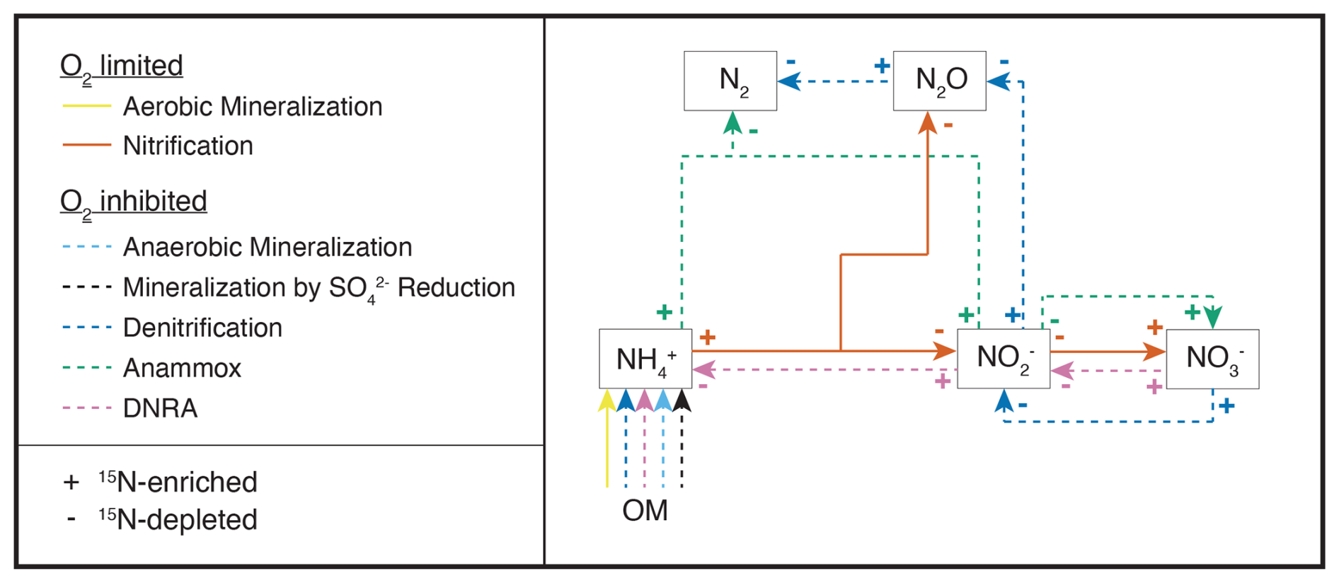 A one-dimensional diffusion-reaction model was developed to simulate the concentrations of inorganic N compounds (NO3-, NO2-, NH4+, N2, N2O), distinguishing between 14N and 15N isotopes (14NO3-, 15NO3-, 14NO2-, 15NO2-, 14NH4+, 15NH4+, 14N2, 14N15N, 15N2, 14N2O, 14N15NO, 15N2O), as well as for O2 and sulfate (SO42-) concentrations. Their production and consumption rates are described by incorporating key processes of the canonical N cycle: aerobic mineralization, denitrification, nitrification, anammox, DNRA, mineralization by SO42- reduction, and anaerobic mineralization (other than SO42- driven) (Fig. 1). All reactions (Table 1) are described using the general formula: