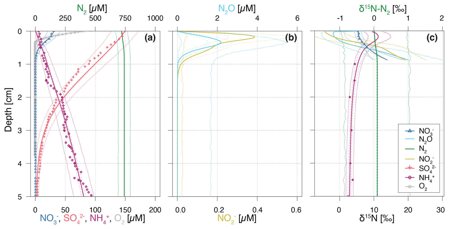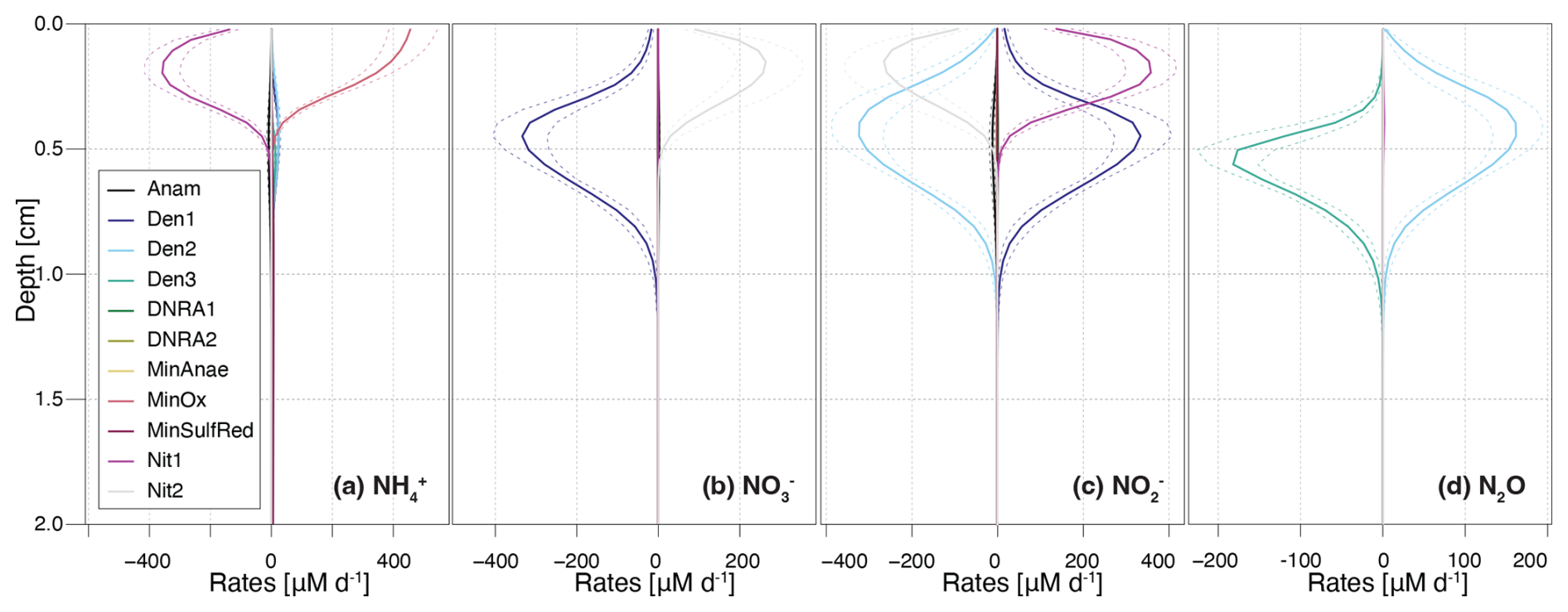 In aquatic systems, benthic habitats are important hotspots in the transformation of large amounts of fixed N (Dale et al., 2019; Pätsch and Kühn, 2008; Xu et al., 2022), owing to sharp oxyclines and the co-occurrence of aerobic and anaerobic processes. The active N cycle in these sediments is driven by the flux of organic matter (OM) from the photic zone along with elevated concentrations of other electron donors (Ibánhez and Rocha, 2017; Wankel et al., 2015). Aerobic reactions, such as nitrification (stepwise NH4+ oxidation to NO3- via nitrite, NO2-, with N2O as by-product), are usually restricted to the top few millimetres in OM-rich sediments (e.g., in small lakes) or extend several centimetres deep in OM-poor sediments (e.g., in large oligotrophic lakes and the ocean) (Pätsch and Kühn, 2008; Wankel et al., 2015). The fate of NO3-, produced via nitrification either locally in the sediments or in the water column, determines a system's capacity to function as an efficient N sink (Wankel et al., 2015). Denitrification, the stepwise reduction of NO3- to N2 (via NO2- and N2O), has been identified as a key pathway for anaerobic N removal. Additionally, anammox, the anaerobic oxidation of NH4+ to N2 using NO2-, can contribute to N loss (Ibánhez and Rocha, 2017; Kampschreur et al., 2012; Wankel et al., 2015), especially in oligotrophic lake sediments (Crowe et al., 2017). In anammox, partial oxidation of NO2- generates NO3- as a by-product to provide reducing equivalents for the fixation of inorganic carbon (C) (Brunner et al., 2013; Strous et al., 1999). Counteracting N removal by anammox and denitrification, the dissimilatory NO3- reduction to NH4+ (DNRA) contributes to N retention (Denk et al., 2017; Ibánhez and Rocha, 2017; Rooze and Meile, 2016). The balance between these N-transforming reactions is strongly influenced by environmental conditions, particularly the ratio of organic C to NO3- and oxygen (O2) availability. For instance, DNRA may be predominant under high C:NO3- ratios (Ibánhez and Rocha, 2017; Kraft et al., 2011; Wang et al., 2020). Oxygen is a central regulator in this context: it controls the coupling of nitrification with denitrification, anammox and DNRA, and modulates N2O production and consumption, with peak N2O yields typically occurring at the oxic-anoxic interface (Ni et al., 2011). The spatial overlap of aerobic and anaerobic N cycling processes at this transition zone in sediments often results in very low concentrations of metabolic intermediates (e.g., N2O) in porewater, complicating their measurements in natural benthic environments. This is particularly true for the analysis of natural-abundance DIN isotopologues, which provide critical insights into N-cycling reactions and pathways. However, measuring these isotopologues, especially low-concentration intermediates in porewater, is technically challenging, if not impossible at present. To overcome these limitations, isotope modelling has become an essential tool for quantifying rapid N turnover at the oxic-anoxic interface, and for evaluating environmental controls on N dynamics and isotope signatures across diverse settings (Denk et al., 2017; Wankel et al., 2015).