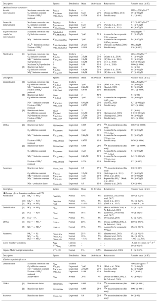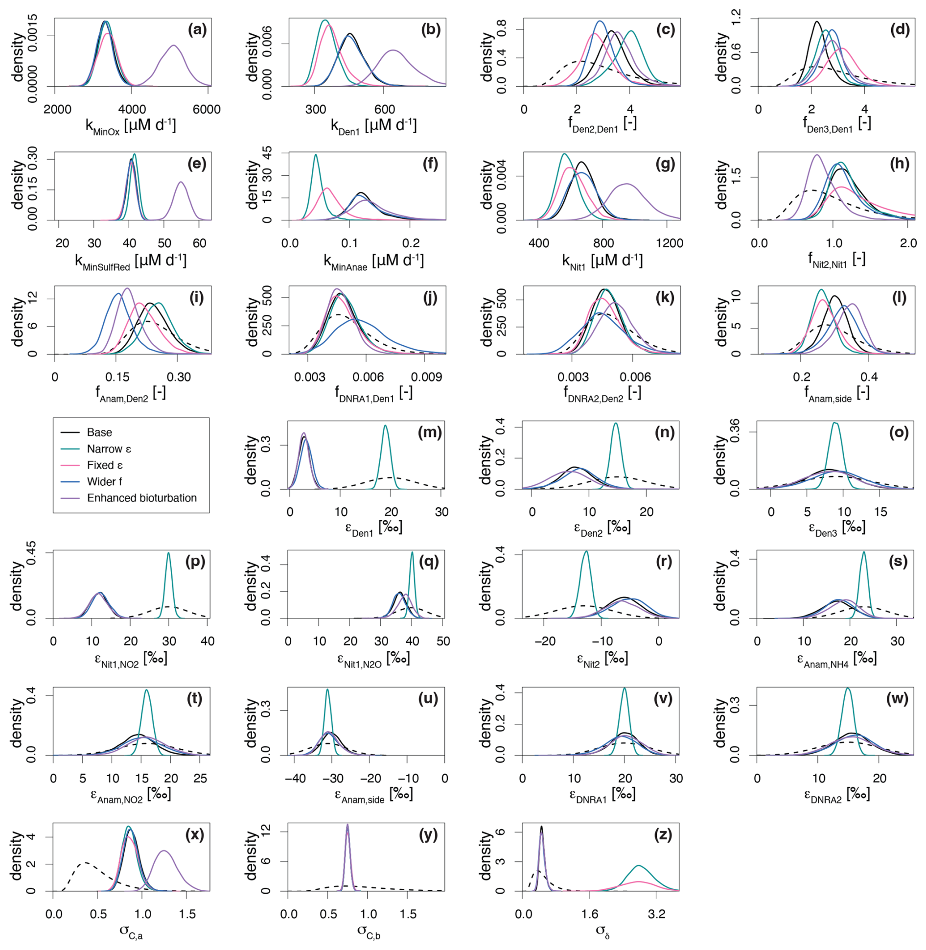 Model parameter values were derived from an extensive literature review, and formulated as prior distributions, as detailed and referenced in Appendix C: Prior values for inference. Positive parameters were parameterized as Lognormal priors, while priors of positive or negative parameters were parameterized as Normal distributions. Mean values were derived from the provided references, standard deviations were assigned either as absolute values or as percentages of the mean, depending on the class of variables. For parameters that are lake-specific (see model assumption iii.) and expected to be well identifiable from data, such as the maximum conversion rates of various processes (i.e., aerobic mineralization, the first step of nitrification, the first step of denitrification, mineralization by SO42- reduction, anaerobic mineralization) and the NH4+ flux from deeper sediment layers, only limited prior knowledge is available, making the use of uniform priors preferable. As their interpretability can be questionable, uniform priors were applied only to parameters expected to be well-identifiable, ensuring that prior variations within the marginal posterior range would remain small, even with alternative broad priors. This approach avoids specifying typical expected values, while maintaining robust identifiability. The maximum conversion rates for anammox, DNRA, as well as the second step of nitrification and the second and third steps of denitrification (Anam, DNRA1, DNRA2, Nit2, Den2 and Den3) were more challenging to identify from data, as the sensitivity of model results to these parameters becomes very low when the concentration of the converted substance becomes small. Additionally, prior specification for these rates was difficult, due to the expected variability among different lakes, similar to other maximum conversion rate parameters. Therefore, their priors were formulated as ratios relative to the better-constrained maximum conversion rate of the first nitrification (i.e., kNit1) or denitrification step (i.e., kDen1). This approach allowed for the characterization of the relative importance of each process without requiring absolute rate values. The joint prior for all parameters was assumed to be an independent combination of their respective marginal prior distributions.