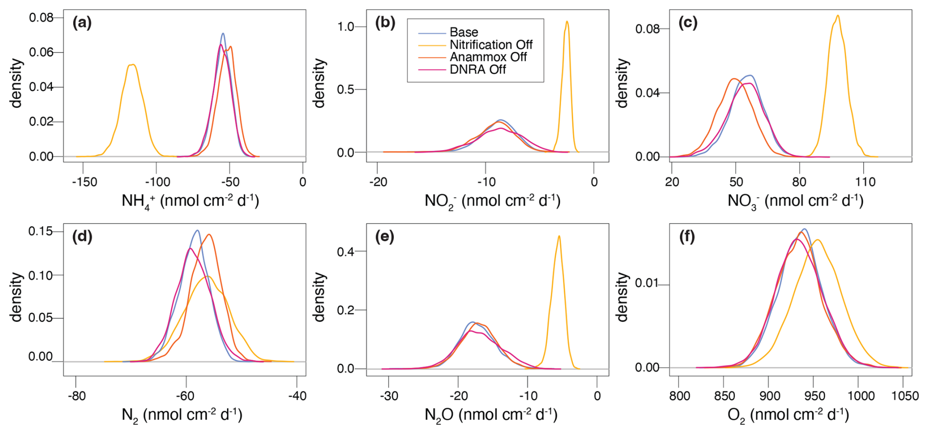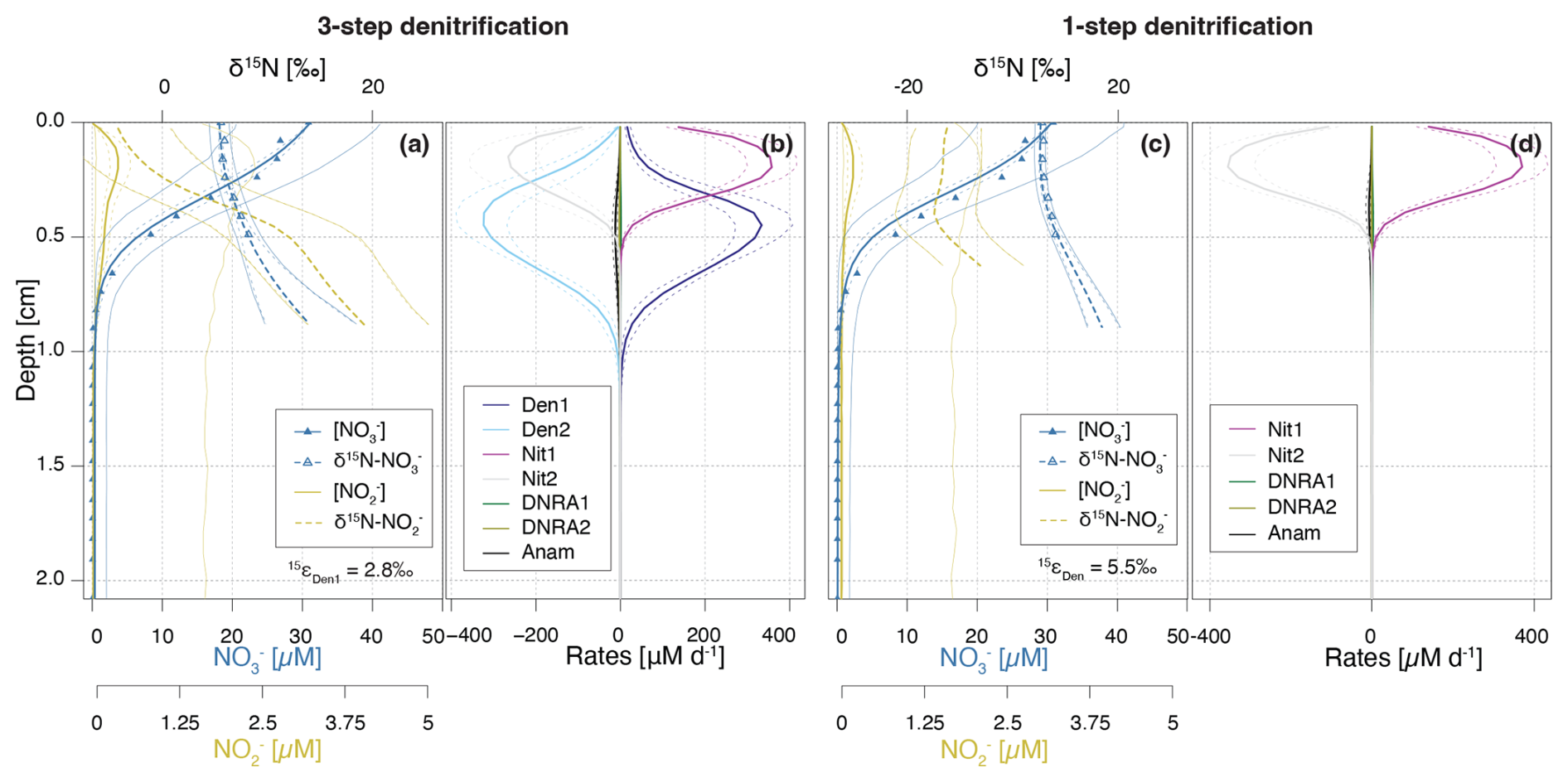 Denitrification is modelled as a three-step process: (1) NO3- to NO2-; (2) NO2- to N2O; and (3) N2O to N2. The first step, typically regarded as the rate-limiting step (Kampschreur et al., 2012), is the primary control on the overall expression of the N isotope effect (Kessler et al., 2014; Rooze and Meile, 2016). To prevent unrealistic rates, subsequent steps are constrained by setting kDen2=fDen2×kDen1 and kDen3=fDen3×kDen1, and specifying priors for fDen2 and fDen3. The re-parameterization of the second and third steps using the fDen2Den1 and fDen3Den1 factors corresponds to exactly the same model without any approximation or simplification. It serves solely to facilitate the specification of priors, as more knowledge is typically available about ratios of maximum rates (i.e., fDen2Den1=kDen2/kDen1) than about the absolute maximum rates themselves. The NO3- N isotope effect during benthic denitrification is known to be suppressed in the overlying water due to diffusion limitation (Dale et al., 2022; Kessler et al., 2014; Lehmann et al., 2003), though its expression at the porewater level remains less well constrained (Wankel et al., 2015). Transiently accumulating intermediates, such as N2O, that can escape to the overlying water and alter benthic N fluxes (Rooze and Meile, 2016), are also considered. Lastly, to ensure mass balance, the model accounts for clumped (doubly substituted; e.g., 15N15NO and 15N15N) isotopocules, but does not distinguish between isotopomers (i.e., 14N15NO and 15N14NO) due to lack of N2O isotope data needed for model validation. For the purpose of comparison with previous N models, a simplified one-step denitrification pathway (NO3- to N2 with no release of NO2- or N2O into the environment) approach is also implemented in the model code.