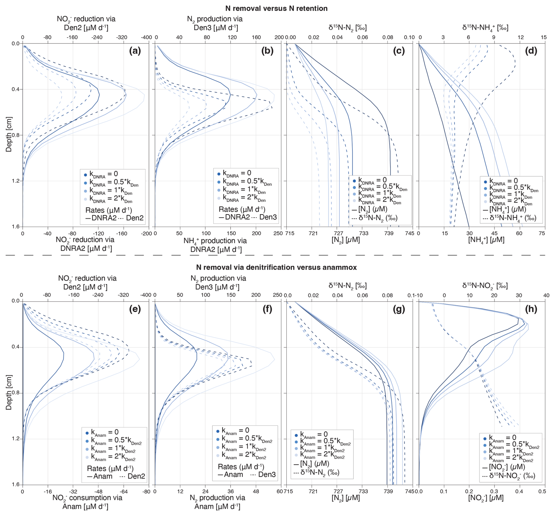 The relative importance of reductive NO3- pathways is constrained by altering maximum conversion rates, k, as: kDNRA1=fDNRA1,Den1×kDen1; kDNRA2=fDNRA2,Den2×kDen2; kAnam=fAnam,Den2×kDen2, where prior information on f factors was obtained from experimental rate measurements (see below). Altogether these reactions provide a comprehensive overview of N isotope dynamics in porewater and enable the assessment of influential environmental conditions in shaping them.