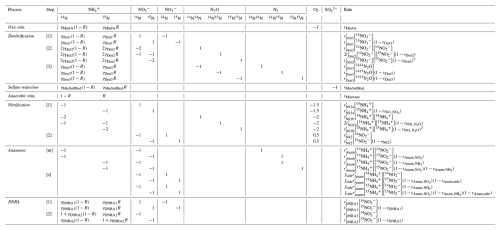 Table 1Chemical equations and reaction rate formulations for 14N and 14N14N compounds across all modelled processes. The rates for 15N, 15N14N, and 15N15N are formulated analogously by replacing the concentration of the isotopologue of interest as needed. The turnover rates for 15N-containing species are scaled by a factor of (1-ε/1000), as outlined in the text. The complete set of equations including all isotopic compositions, and the process stoichiometry is provided in Appendix A: Model processes and stoichiometry. Anaerobic mineralization encompasses OM degradation coupled to iron and manganese reduction, as well as through methanogenesis.