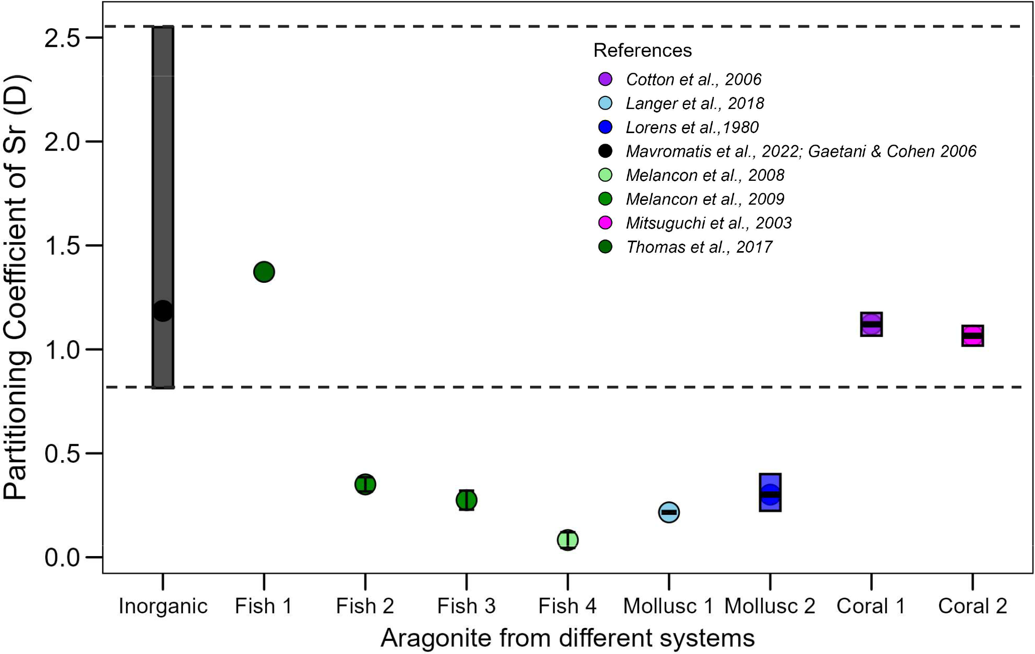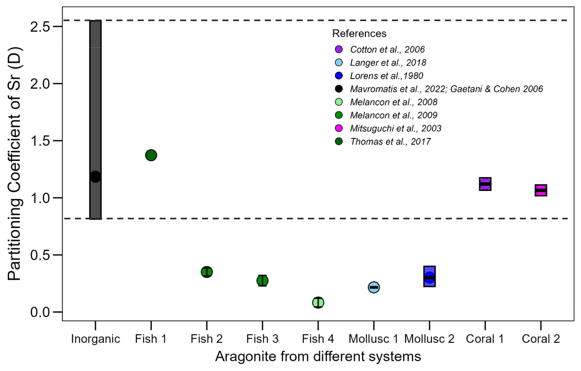 Figure 1Sr partitioning coefficient range (DSr= ()biomineral ()seawater) observed in different organisms with aragonite biominerals (shown in various colors) compared with the range for inorganic aragonite (black bar, with the full range indicated by the dashed black line). The references of the data are listed in the figure legend.