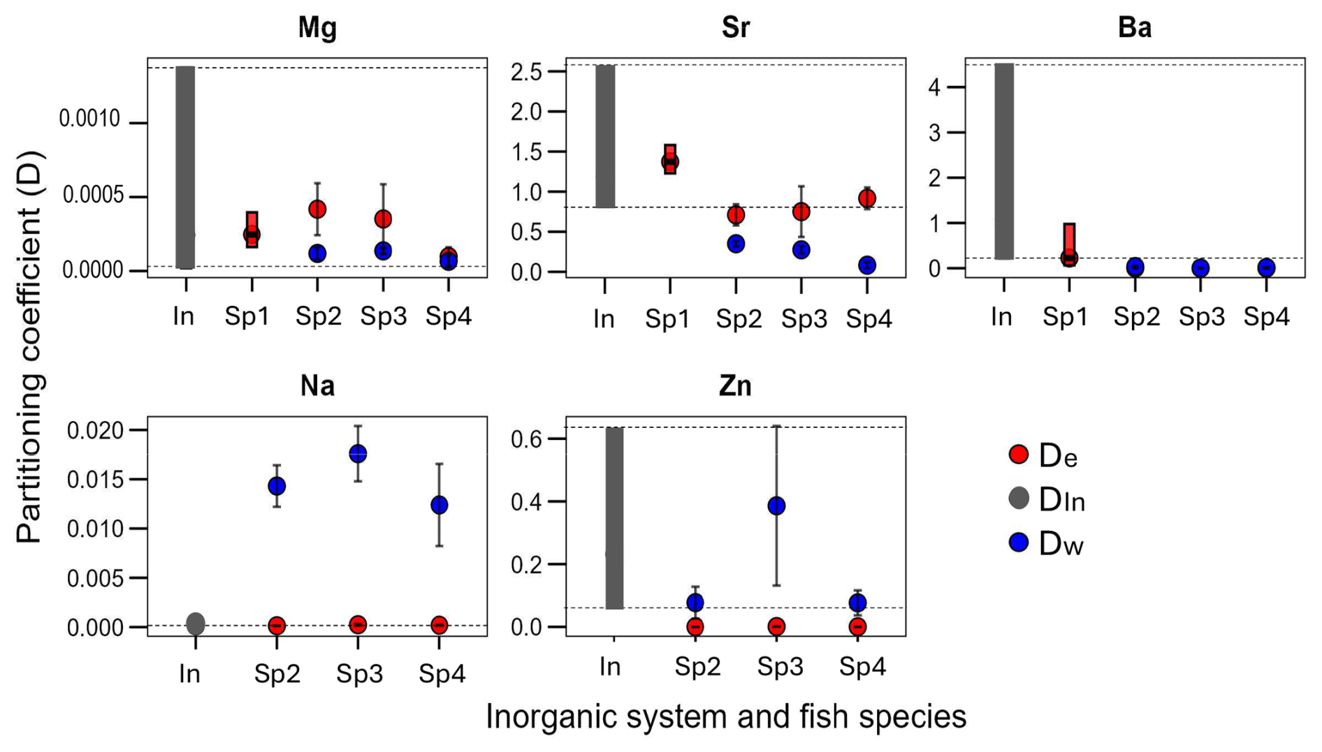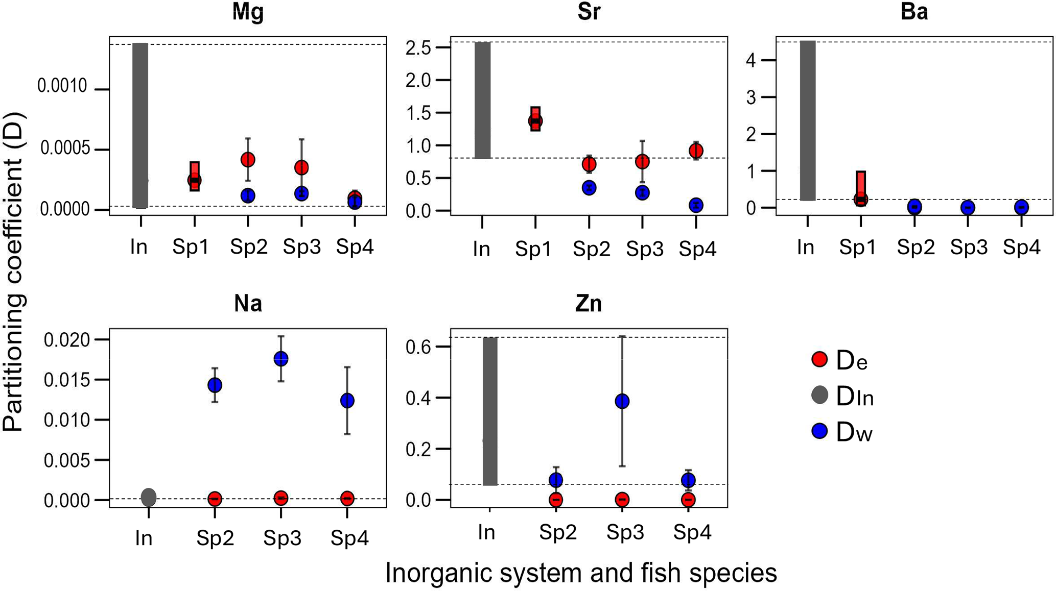 Figure 2The partitioning coefficient (D) per element (Mg, Sr, Ba, Na, Zn), the range of the inorganic system (In) and the mean ± SD of the D in three different freshwater fish burbot Lota lota (Sp2), lake trout Salvelinus namaycush (Sp3)and a walleye Sander vitreus (Sp4) and the range of the marine fish the Acanthopagrus butcheri (Sp1). Colour code: red is the De (endolymph as parent solution) and blue the Dw (water as parent solution) for fish and black is the DIn of the inorganic aragonite.