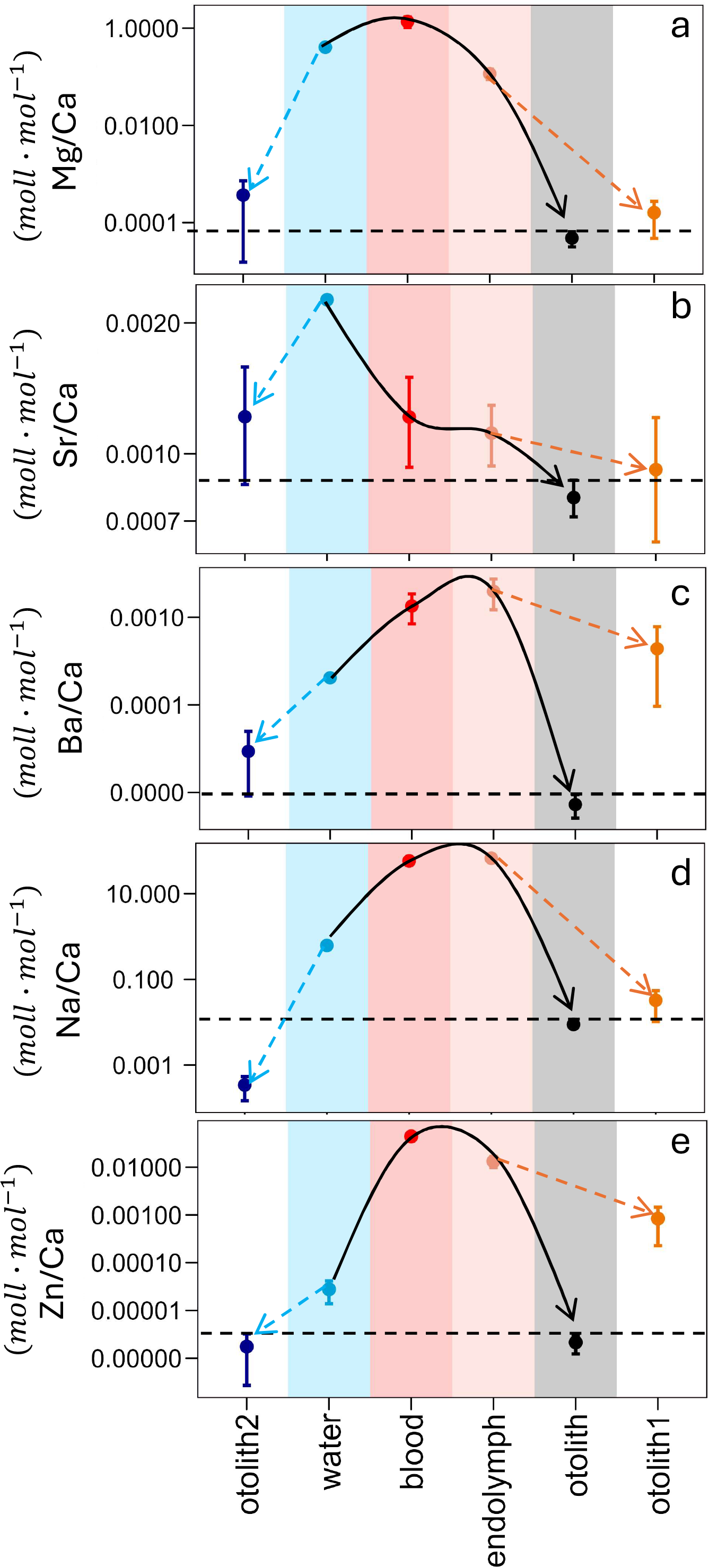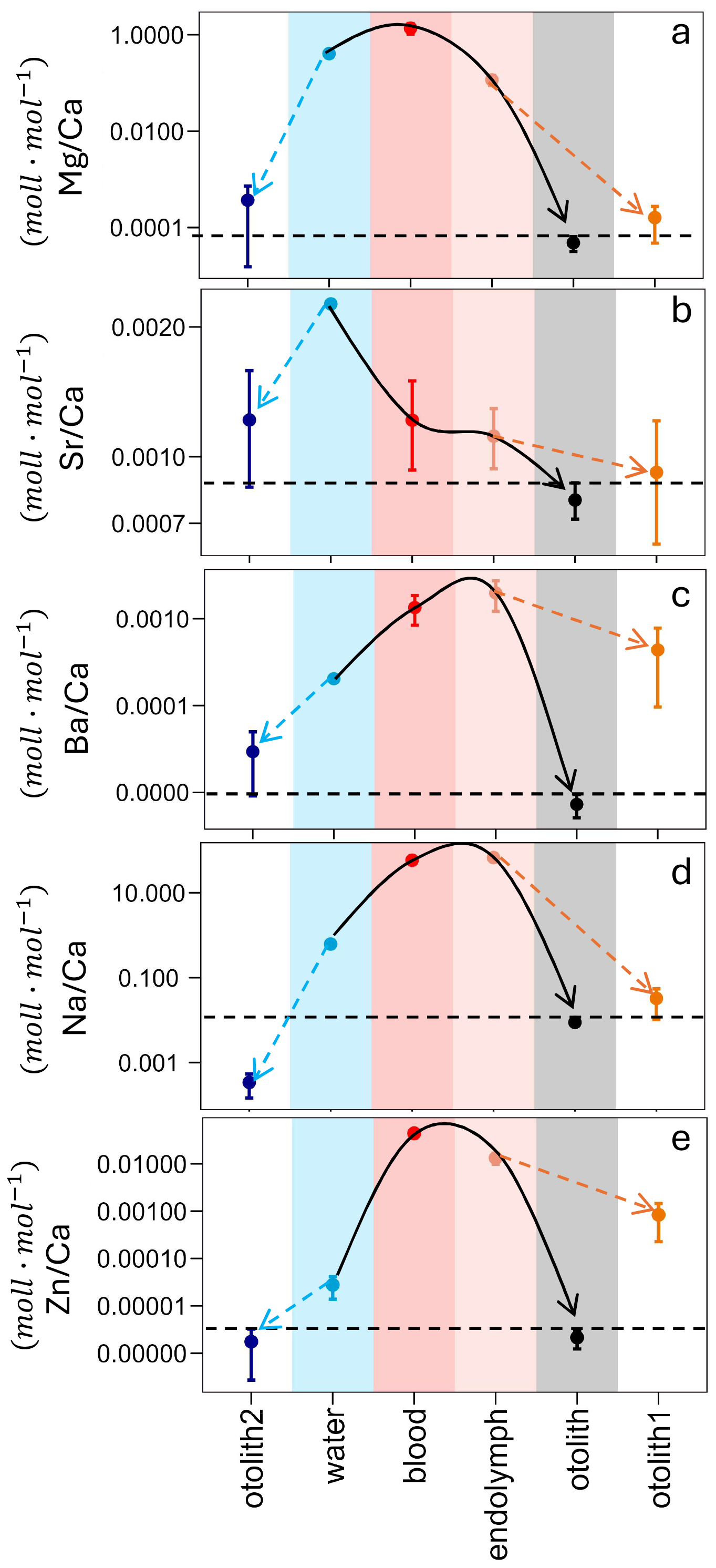 Several things can be gleaned from this figure. The first concerns the match/mismatch of otolith and otolith1. A match indicates that partitioning from endolymph to otolith could be inorganic. This is the case for Sr, Mg, and Na. Note that the same conclusion can be drawn from Fig. 2 with the exception of DSr which does not fall within the inorganic range but is close to it. The reason for this discrepancy is that in Fig. 2a mean and standard deviation is given whereas in Fig. 3 the minimum value of DIn is used. The latter choice represents a conservative approach aiming at a match between otolith and otolith1. The case of Sr is therefore borderline, but its behaviour could still be considered inorganic. In stark contrast, the behaviour of Ba and Zn is clearly not inorganic.