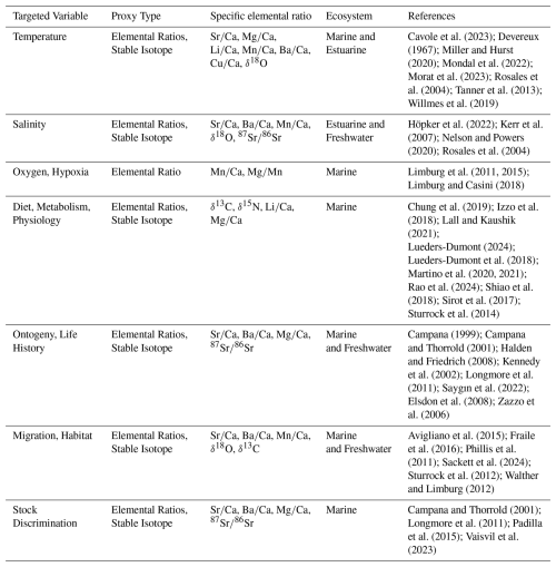 Hüssy, K., Limburg, K. E., de Pontual, H., Thomas, O. R. B., Cook, P. K., Heimbrand, Y., Blass, M., and Sturrock, A. M.: Trace element patterns in otoliths: the role of biomineralization, Rev. Fish. Sci. Aquac., 29, 445–477, https://doi.org/10.1080/23308249.2020.1760204, 2021.