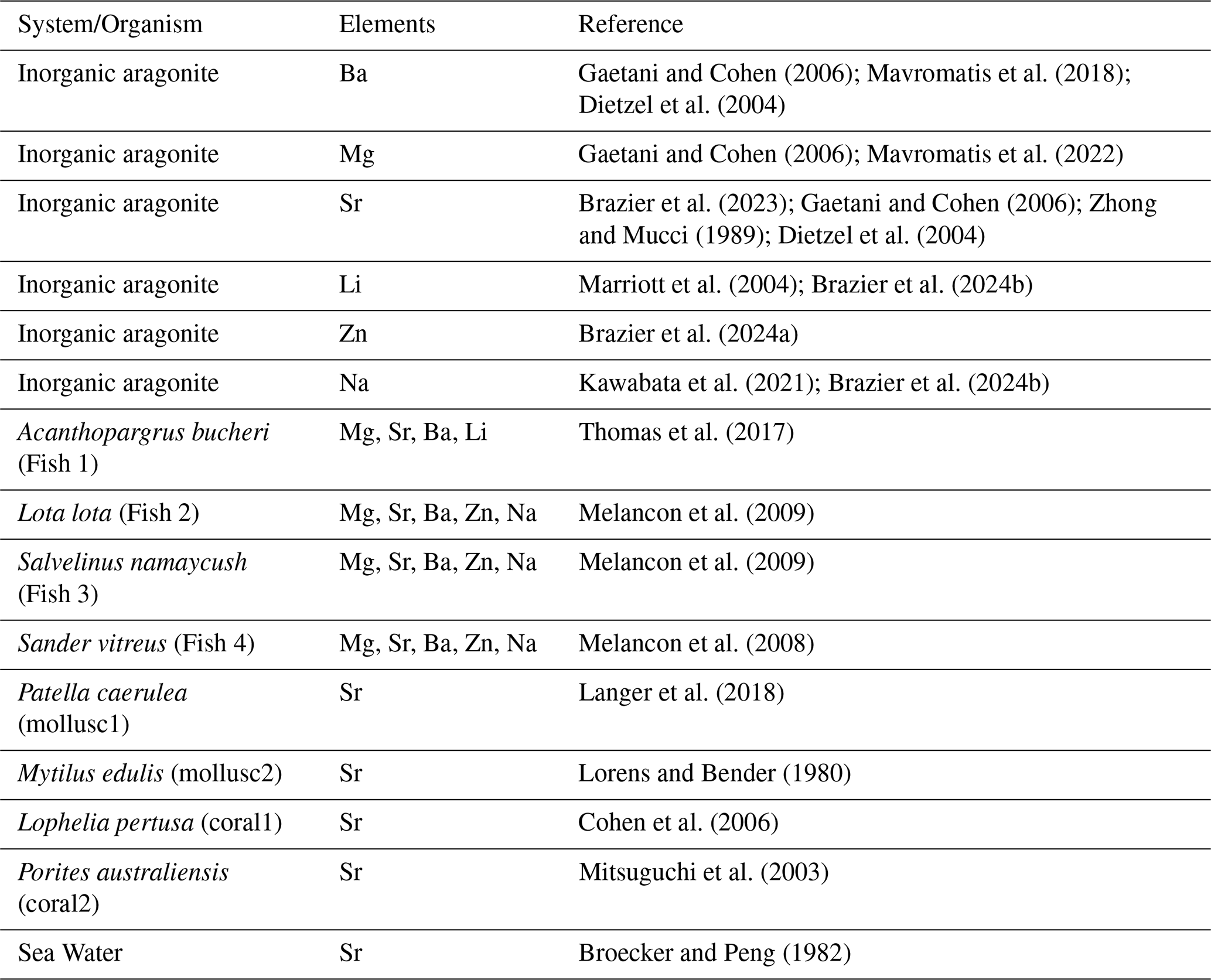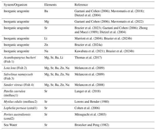 We address the following question. Does the numerical value of the foreign element partitioning coefficient from endolymph into otolith equal that of the partitioning coefficient from an aqueous solution into pure aragonite? As mentioned in the introduction, Fig. 1 illustrates the range of the Sr partitioning coefficient (D) in different calcifying marine organisms, we used as parent solution seawater and the ratios of the elements in each organism from the literature (Broecker and Peng, 1982; Cohen et al., 2006; Langer et al., 2018; Lorens and Bender, 1980; Mitsuguchi et al., 2003).