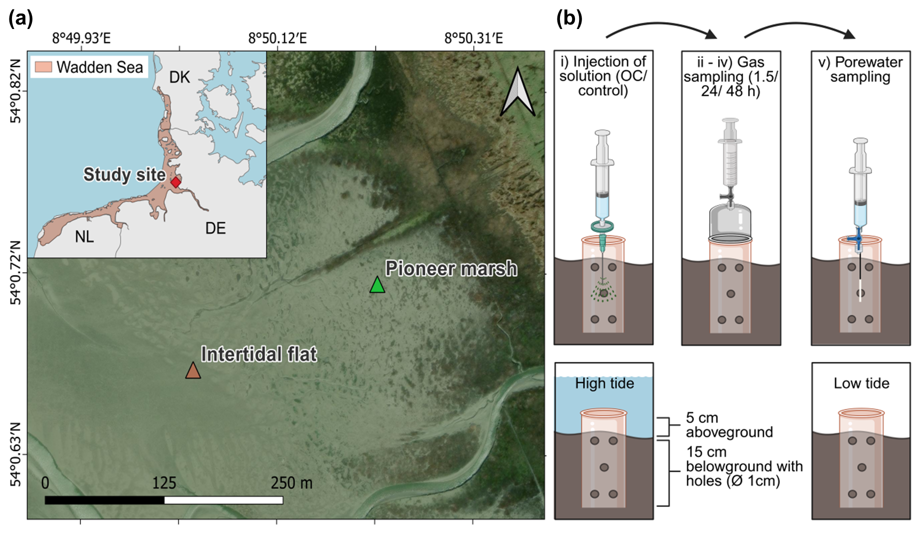 The experiment was conducted similarly in both zones, the pioneer marsh and intertidal flat, using spatial triplicates and comprising four injection cycles (Fig. 1b). One injection cycle consisted of (i) the injection of the anoxic sterile solution (OC or control solution), followed by (ii) the first gas sampling 1.5 h after the injection. Gas sampling was repeated (iii) 24 h after the injection and (iv) 48 h after the injection. After the 48 h gas sampling, (v) porewater was collected. Injection of the solutions and sampling was done during low tide. The solution for the different treatments was slowly injected in step (i) with a bent needle at a depth of approximately 5–10 cm in the middle of each plot into the sediment. The injected solution was filtered (PES filter, pore size 0.22 µm, pre-rinsed with double deionized water) during injection to ensure that the solutions were sterile.