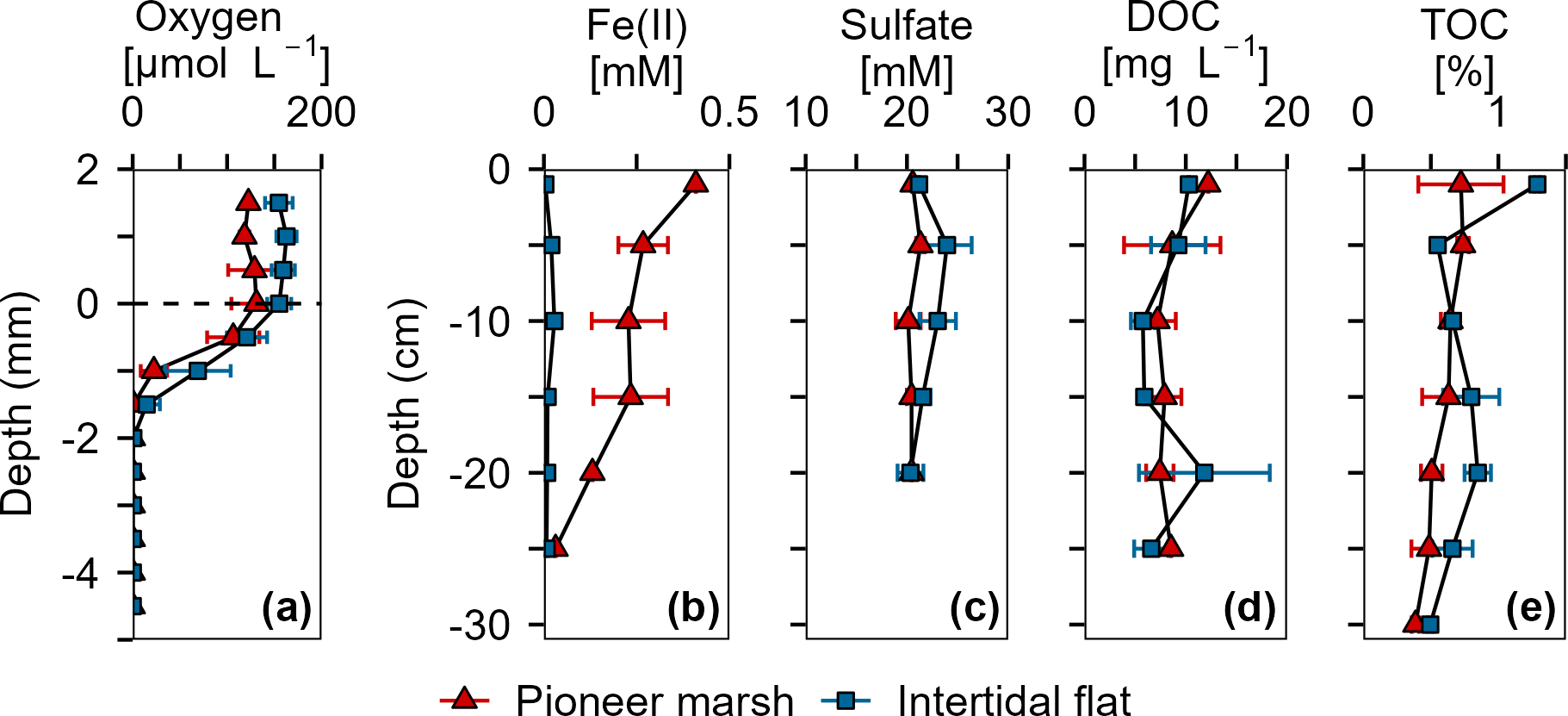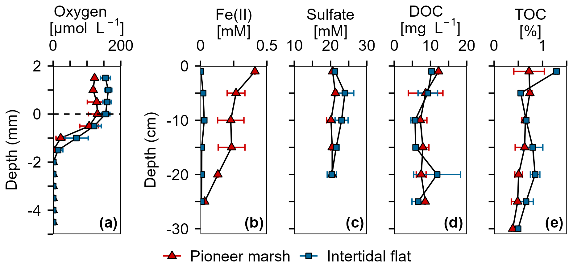 Figure 2Overview of porewater and sediment biogeochemistry in terms of electron acceptors (O2, Fe(III), SO42-) and electron donor (DOC, TOC) from in situ push cores in the pioneer marsh (red triangles) and intertidal flat (blue squares). (a) Oxygen concentration profiles measured in intact cores using microsensors. Note that these cores were collected in 2022, separate from the push cores used for analysis shown in (b)(e). Two cores were collected from each zone and two to four profiles were taken from each core, shortly (within hours) after sampling. (b) Ferrous iron in the porewater, as an indicator of Fe(III) reduction. (c) Sulfate concentrations in the porewater. (d) Dissolved organic carbon in the porewater. (e) Total organic carbon in the sediment. For (b)(d), push cores were taken in triplicates in both zones to a depth of 25 cm in 2023. Duplicate push cores for (e) the TOC were sampled in 2022. For all sub-figures, markers denote mean ± standard deviation (due to limited sample mass, some depth values only show mean and the range of two samples, or only a single value). All cores were sampled during low tide.