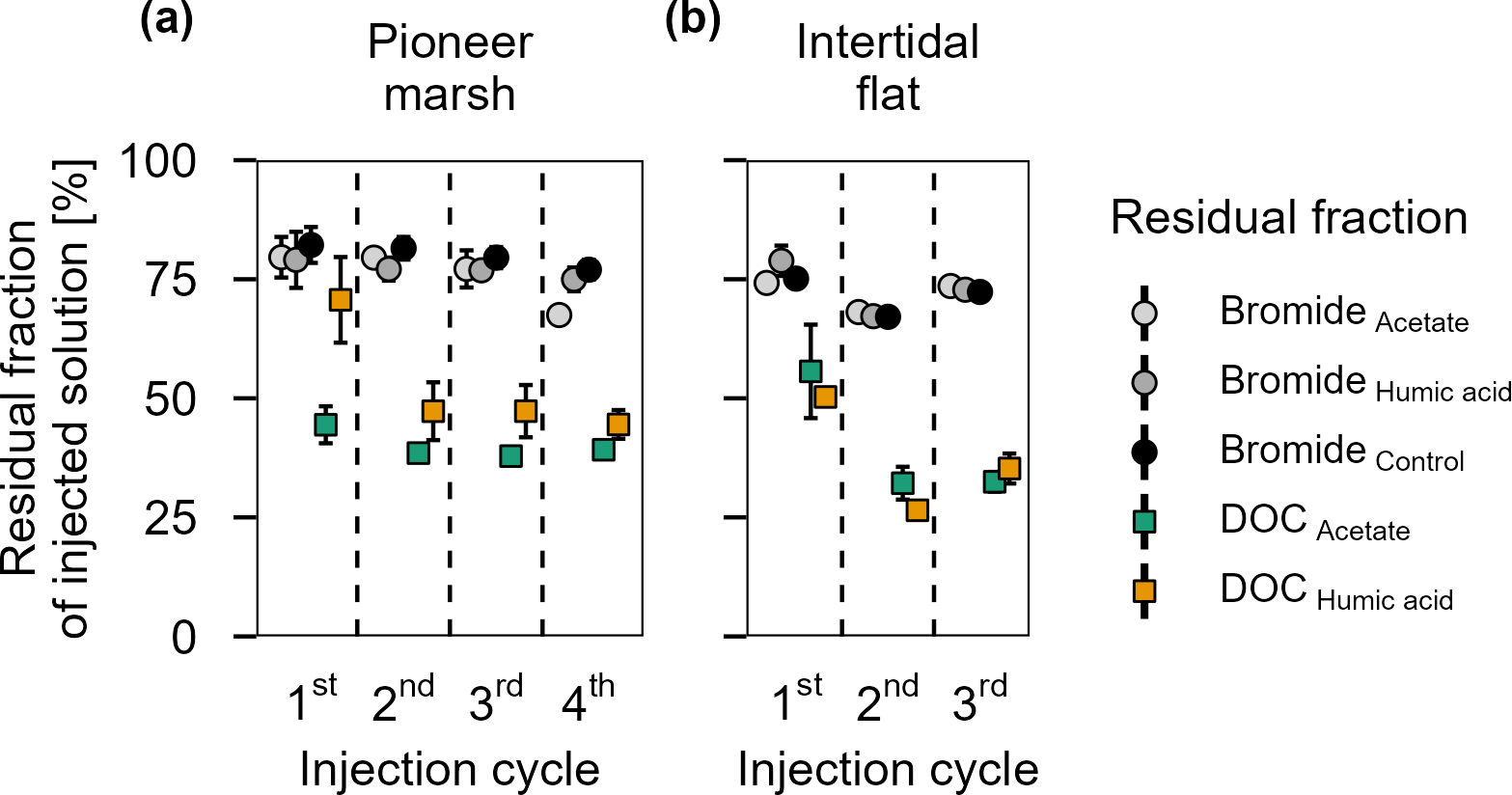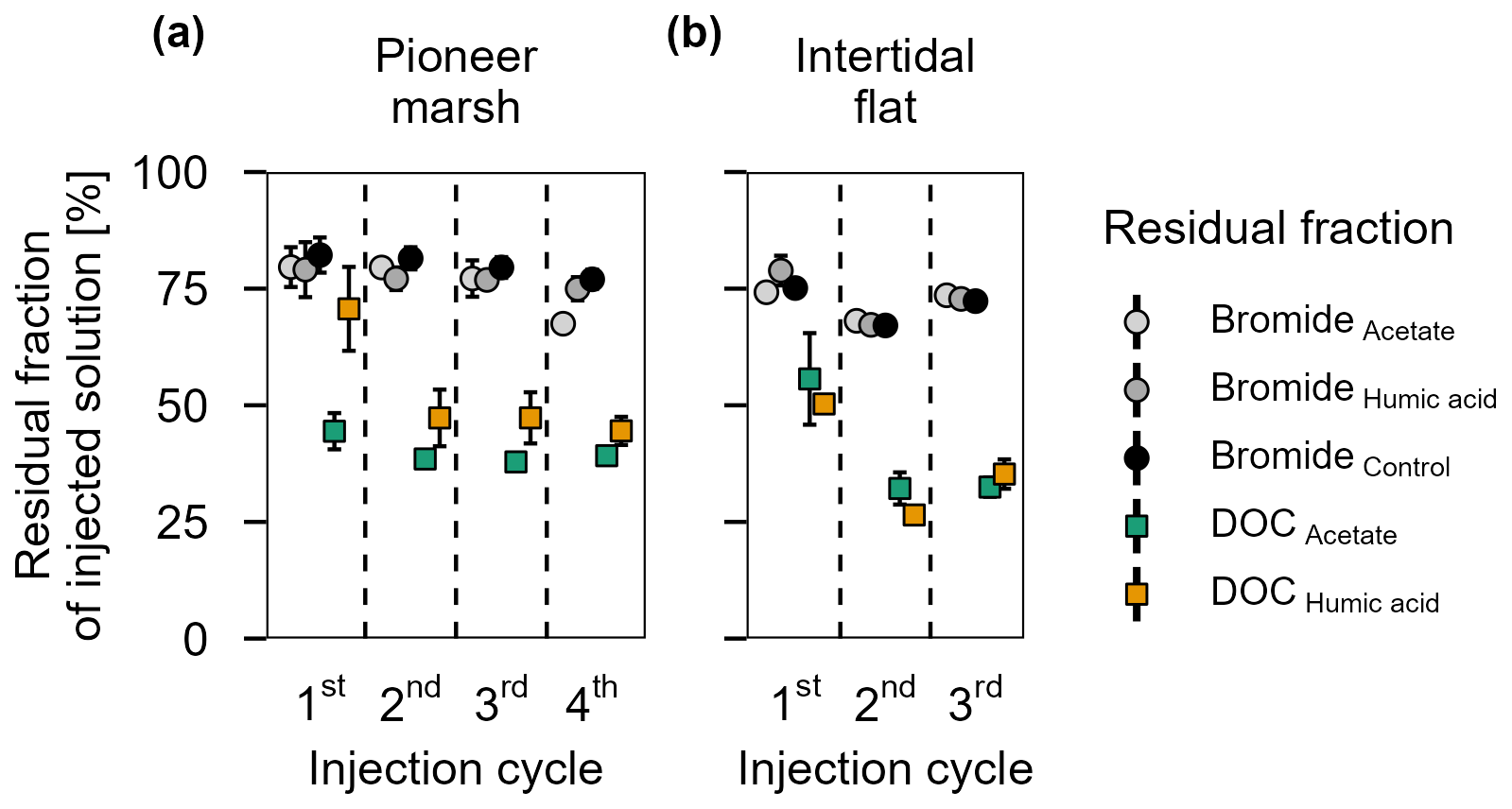 Figure 3Residual fraction of injected solutions (Br and DOC) in percentage after 48 h for treatments (acetate, humic acid) and control plots in the (a) pioneer zone (over four injection cycles) and (b) intertidal flat (over three injection cycles). Coloured squares show the residual fraction of injected DOC (acetate in green and humic acid in orange). The grey shaded circles represent the residual of Br from the different treatments and the control. The values were calculated based on the ratio between the measured DOC or Br concentration (porewater concentration 48 h post injection) and the expected DOC or Br concentration (native + added). Markers represent the mean of the triplicates, with error bars indicating the corresponding standard error for treatments and control in both zones for DOC and Br across all injection cycles.