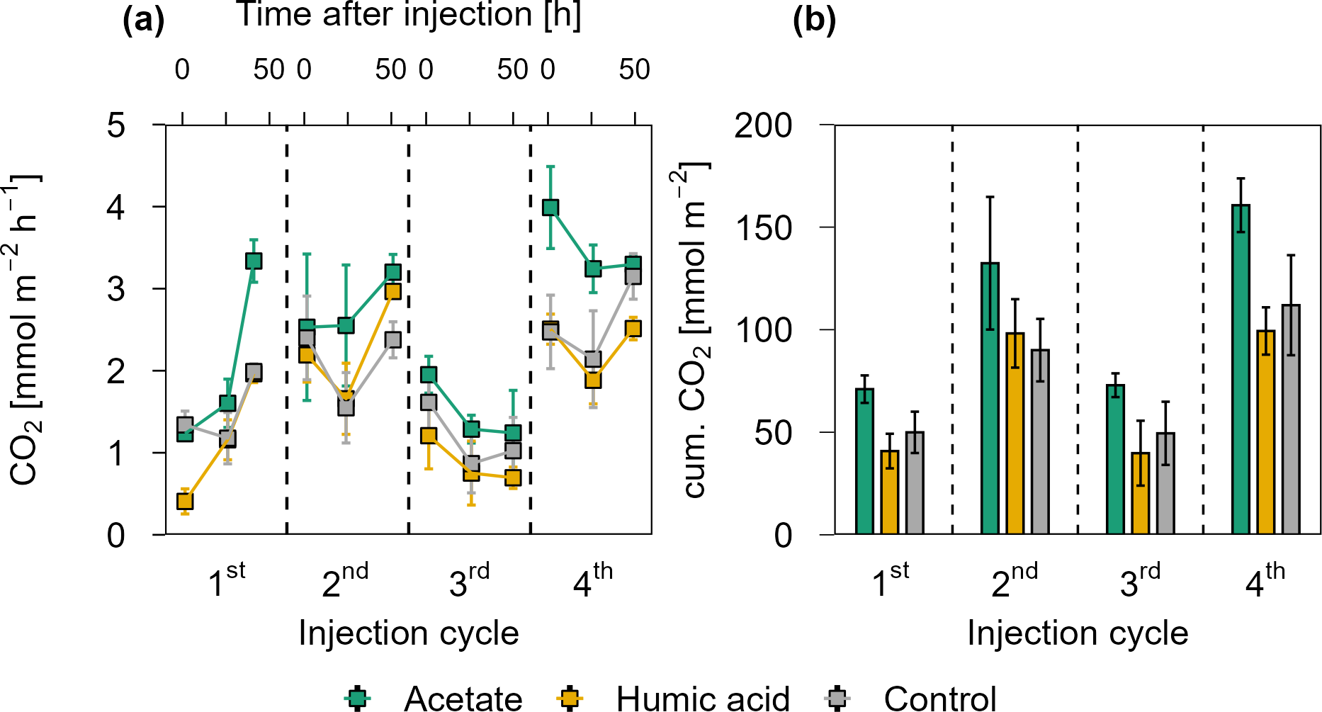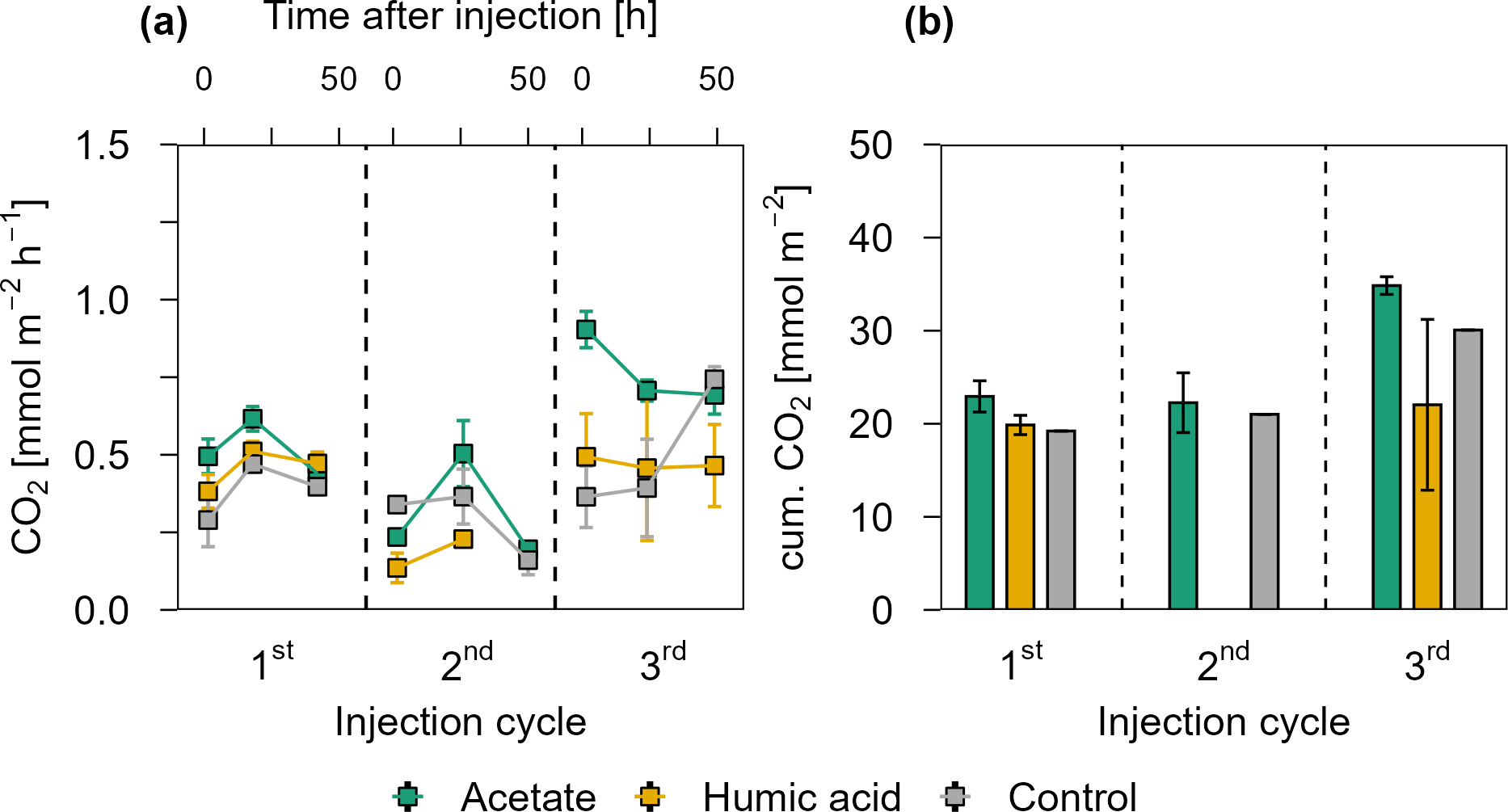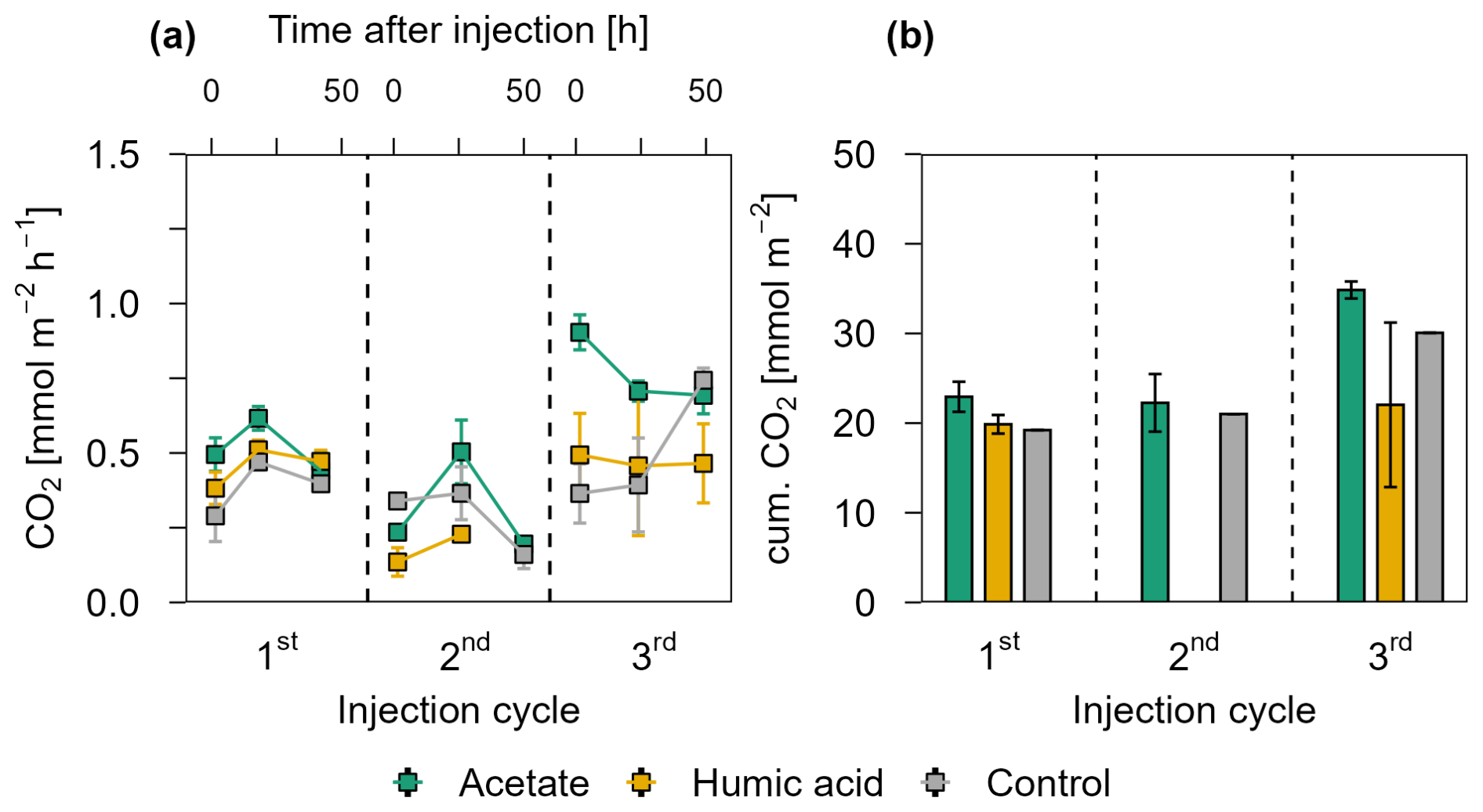 Figure 4CO2 release over four OC injection cycles for the acetate, humic acid, and control plots in the pioneer marsh. The dashed lines separate the individual injection cycles. (a) presents individual measured CO2 fluxes 1.5, 24, and 48 h after injection in CO2 mmol m−2 h−1. Acetate (green), humic acid (orange), and NaCl for the control (grey) were injected into the sediment and GHG fluxes were measured directly above the injection spot at the aforementioned time intervals. (b) shows the cumulative CO2 emissions in CO2 mmol m−2 over one injection cycle for each treatment and control. We note here that some variability in the fluxes based on factors such as day/night could not be captured in our sampling approach; we therefore aimed to use a consistent approach and report relative changes rather than emphasize absolute values. For (a) and (b), markers represent mean ± standard error of triplicates for all treatments and the control across injection cycles. For the 1st and 3rd injection cycle for the acetate treatment (both 1.5 h values) were based on duplicate measurements, which is thus also the case for the (b) cumulative CO2 emission of these cycles.