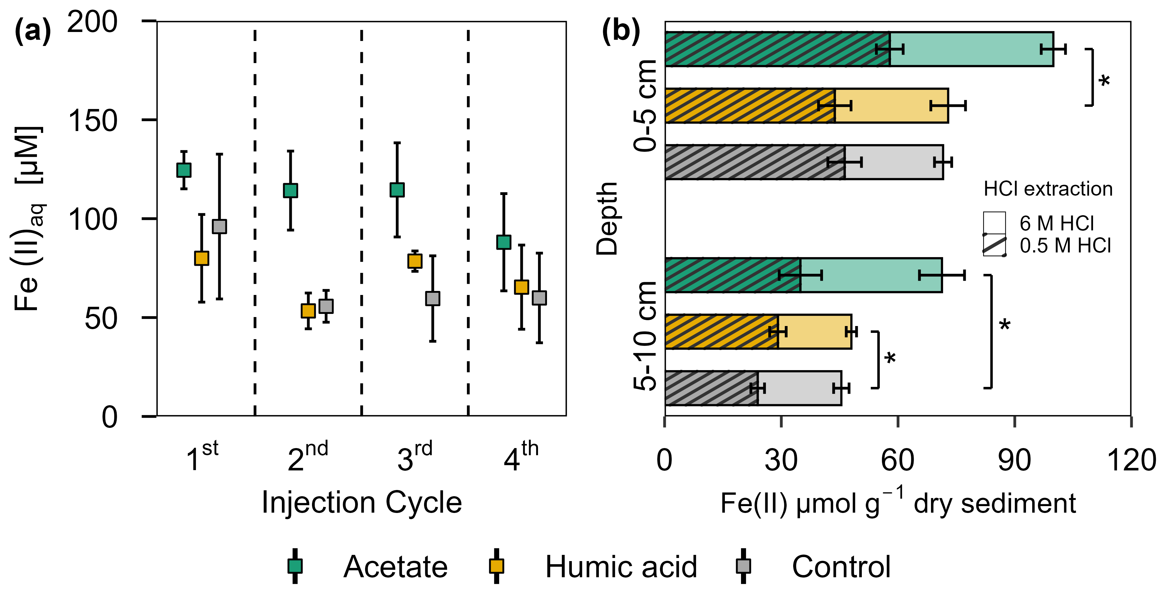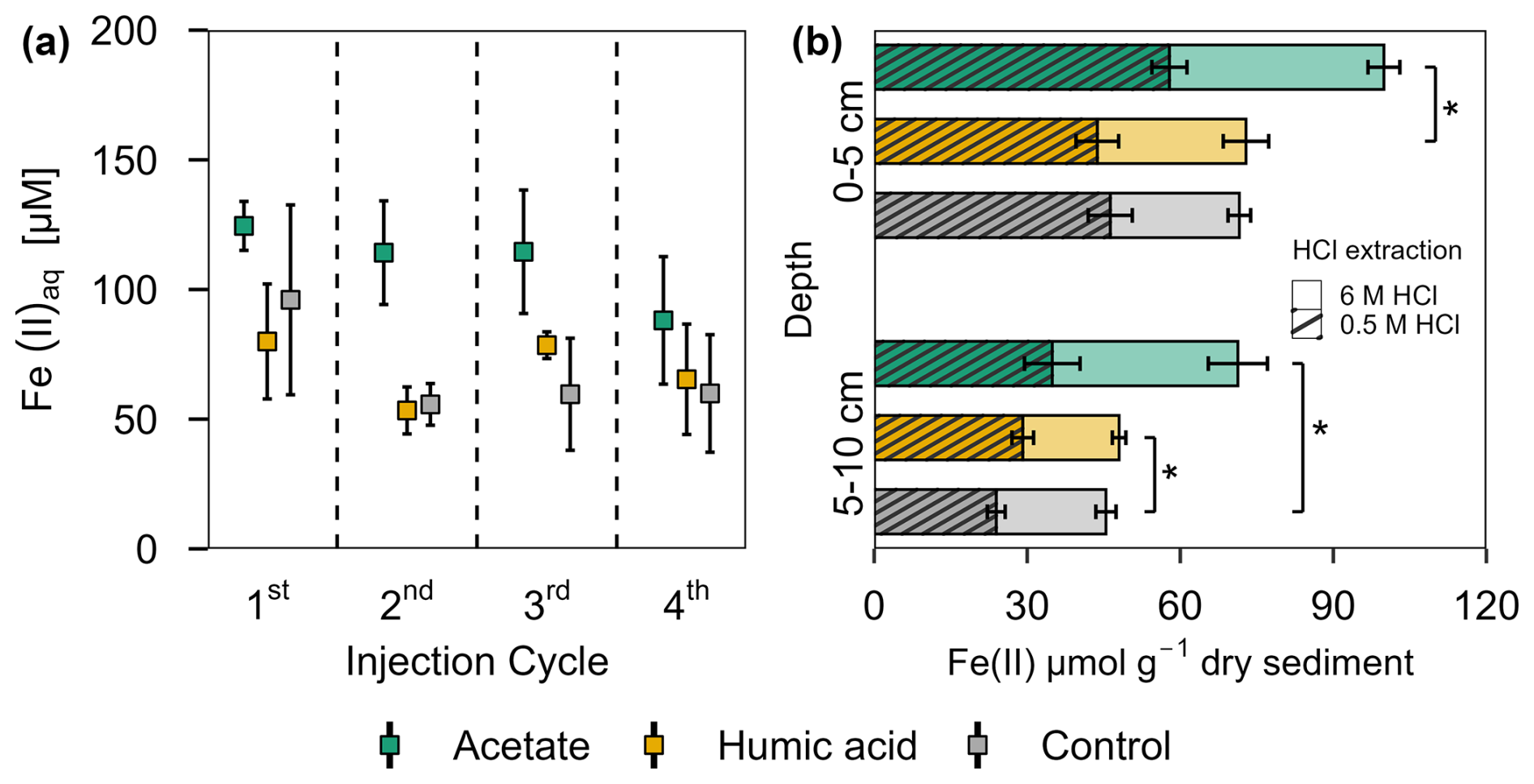 Figure 5Ferrous iron in (a) porewater and (b) solid phase from acetate and humic acid treated plots and the control plots in the pioneer marsh. (a) Aqueous ferrous iron (Fe(II)aq) [µM] sampled after each injection cycle (cycles are separated by the dashed line). Triplicates for each treatment and control for each injection cycle were collected and mean ± standard error is shown. (b) HCl extractable Fe(II) content [µmol g−1 dry sediment] at two different depths (0–5 and 5–10 cm) sampled at the end of all four injection cycles. Different colour coding was used for contrasting treatments: acetate treatment (green), humic acid treatment (orange), and control (grey). Striped bars represent poorly crystalline Fe(II) (0.5 M HCl extraction) and solid bars higher crystalline Fe(II) (6 M HCl extraction). The 0.5 M HCl extract was subtracted from the 6 M HCl extracted fraction to separate poorly and higher crystalline Fe(II). Significance is denoted for the 0.5 M HCl extraction. Statistical details are given in the Supplement (Table S11), significance level * p< 0.05. For each treatment and control, each spatial triplicate (n=3) was analyzed in triplicate (total n=9) for each depth (0–5 and 5–10 cm); results are presented as mean ± standard error.