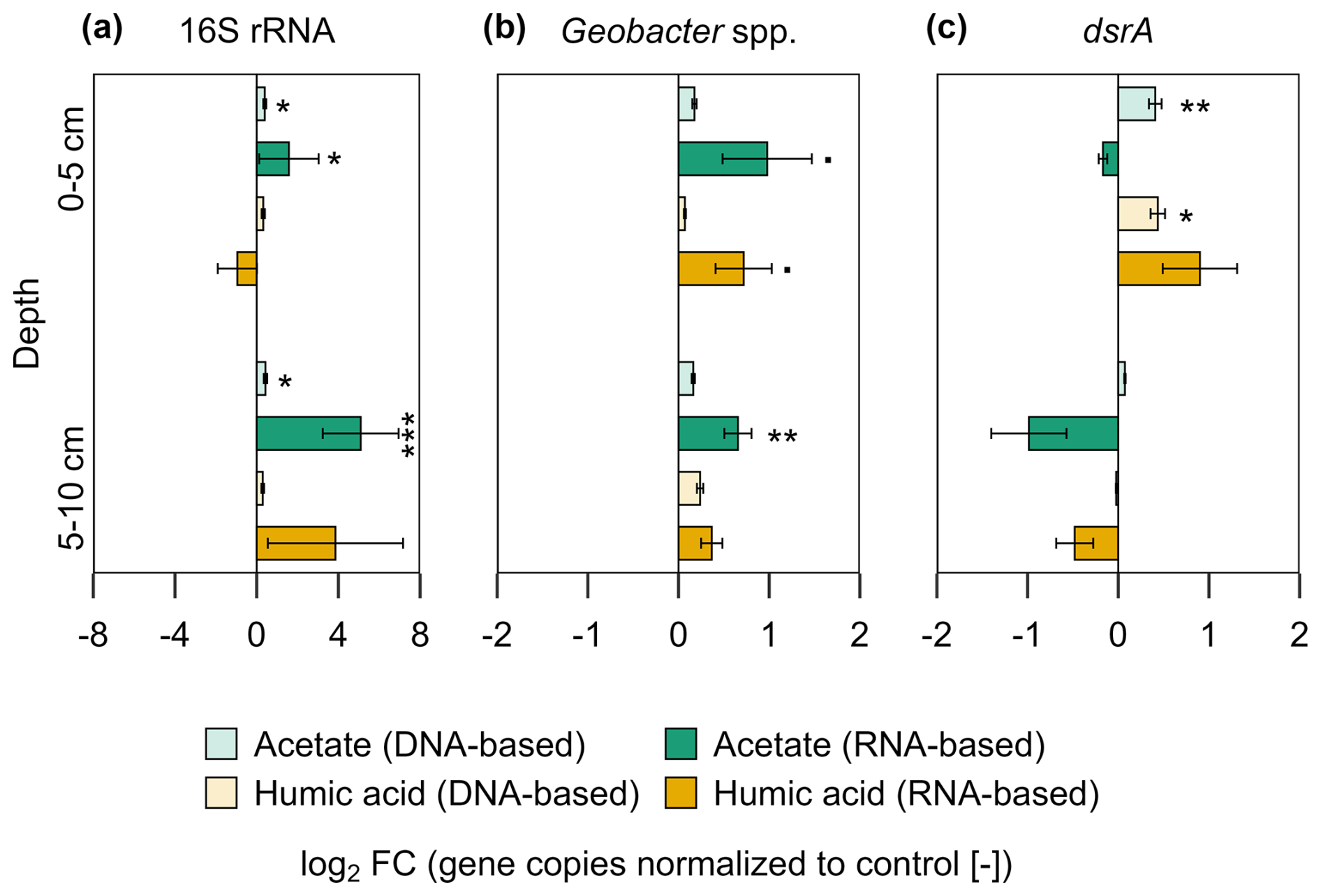 Figure 6Bacterial gene copy numbers of (a) 16S rRNA, (b) Geobacter spp., and (c) dsrA for acetate and humic acid treatment normalized to the control in the pioneer marsh. The values are represented as log2 fold change (FC). Values > 0 indicate an upregulation while values <0 indicate downregulation of the genes compared to the control (acetate in green, humic acid in orange). DNA-based numbers are given in lighter colours and RNA-based in darker colours. Statistical differences in the absolute gene copy numbers are indicated as stars in the figure: significant codes are p=0.05, * p≤0.05, ** p≤0.01, and *** p≤0.001. Absolute gene copy numbers given in Supplement, Fig. S7. Sample sizes include triplicates of each treatment and control at both depths, represented as mean ± standard error (exception of duplicate measurements for 16S rRNA-based humic substances (5–10 cm) and 16S rRNA-based control (0–5 cm)).