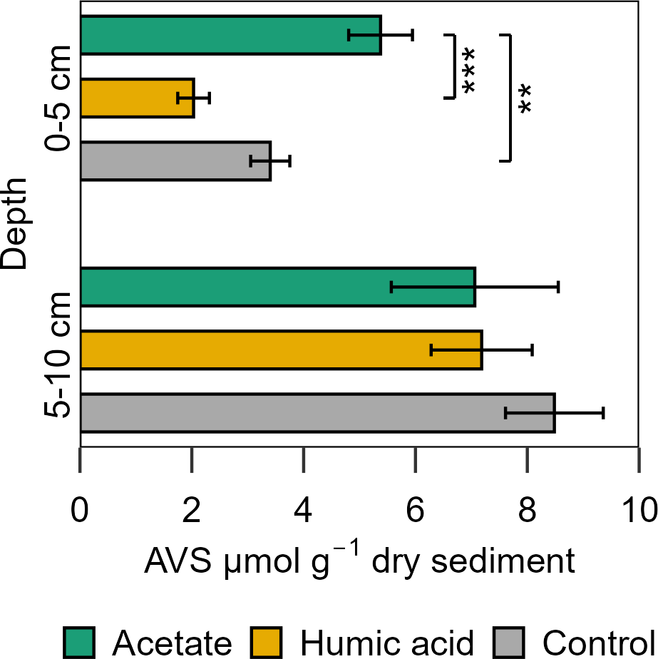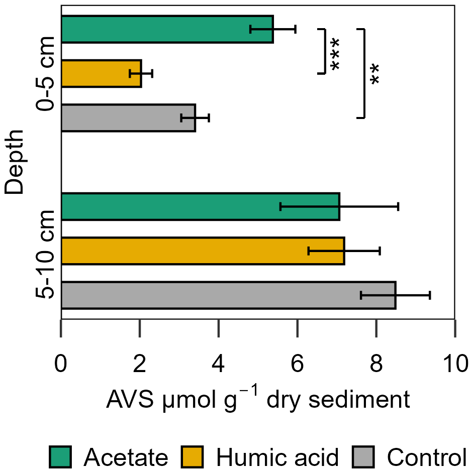 For porewater S(II)tot, no large differences were measured between the treatments and control in the intertidal flat. The concentrations of both treatments and the control were in a similar range over all injection cycles, 0.62 ± 0.01 to 1.73 ± 0.67 µM S(II)tot (Fig. S11). In contrast, the AVS in the solid phase exhibited a significant difference between the treatments and the control (Fig. 8). Higher AVS contents were measured in the acetate plots. This difference was strongly pronounced in the upper 5 cm in the acetate plots relative to the setups amended with humic acid and the control (p< 0.001 and p=0.007, respectively, Table S13). AVS content in the upper 5 cm was 5.38 ± 0.57 µmol g−1 sediment from the acetate plots, 2.03 ± 0.28 µmol g−1 sediment from the humic acid plots, and 3.40 ± 0.35 µmol g−1 sediment from the control. In the deeper layer (5–10 cm), the differences between treatments and control were statistically negligible (p> 0.05).