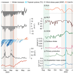 TC2 (5–9 January 2023), in contrast, did not directly pass over the station but remained southwest of TJ-S. Nevertheless, we still observed increases in chlorophyll concentration, DCM shoaling, and elevated fecal pellet fluxes (Fig. 7j), indicating that even peripheral cyclone influence can enhance local BCP. These findings highlight that both direct and indirect impacts of tropical cyclones can substantially stimulate primary production and fecal pellet carbon export in the southern SCS, underscoring the key role of tropical cyclones to mesopelagic carbon export. However, the absence of cyclones from February–March suggests that other physical or biochemical processes must contribute to the spring peak.