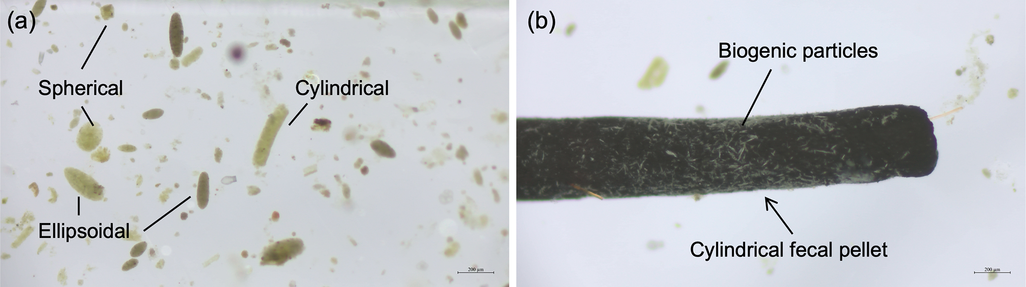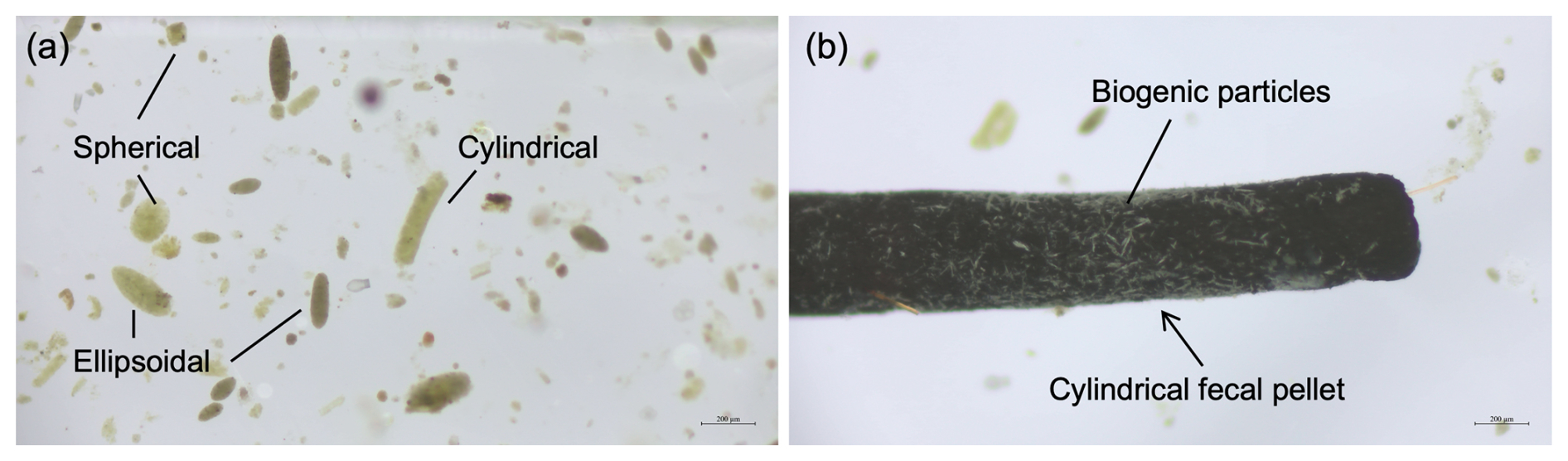 Figure 2Optical micrograph of fecal pellets from typical samples at TJ-S in the southern SCS. (a) Three types of fecal pellets (spherical, cylindrical, and ellipsoidal). (b) A carbon-rich cylindrical fecal pellet with biogenic particles attached to its surface.