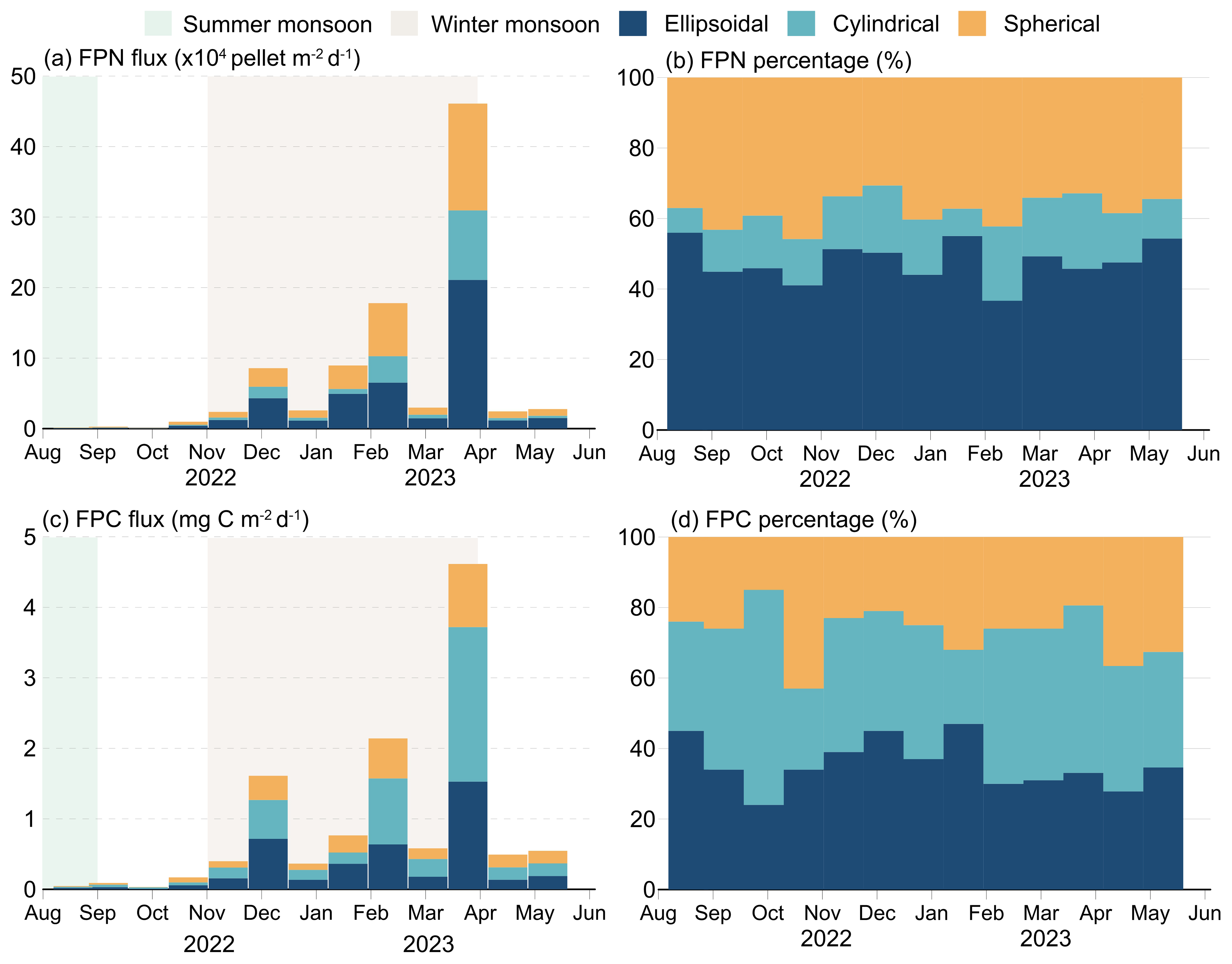 FPN ranged from 9.4×102 to 4.61×105 pellets (mean: 7.39×104 pellets , Fig. 3a), while FPC spanned from 0.03 mg C to 4.62 mg C (mean: 0.91 mg C , Fig. 3c), both exhibiting pronounced seasonal variations. Both fluxes reached annual minimum in late summer, with FPN of 937 pellets and FPC of 0.03 mg C in mid-September. From October–February, both fluxes increased steadily, reaching a major peak at the end of February, when FPN rose to 1.78×105 pellets and FPC to 2.14 mg C . A secondary peak occurred in late November, when FPN surging to 8.57×104 pellets , and FPC reaching 1.61 mg C , a 4–5 fold increase relative to adjacent samples. In early March, fluxes decreased again, with FPN dropping to 2.98×104 pellets and FPC decreasing to 0.58 mg C . However, a sharp surge followed in mid-March, when FPN surged to 4.61×105 pellets and FPC to 4.62 mg C , representing the annual maximum. This March peak was 2–3 times greater than the late February and November peaks, and was 10–17 times higher than adjacent samples. Fluxes declined from April–May, averaging 2.61×104 pellets for FPN and 0.52 mg C for FPC, with a slight increasing trend noted in May.