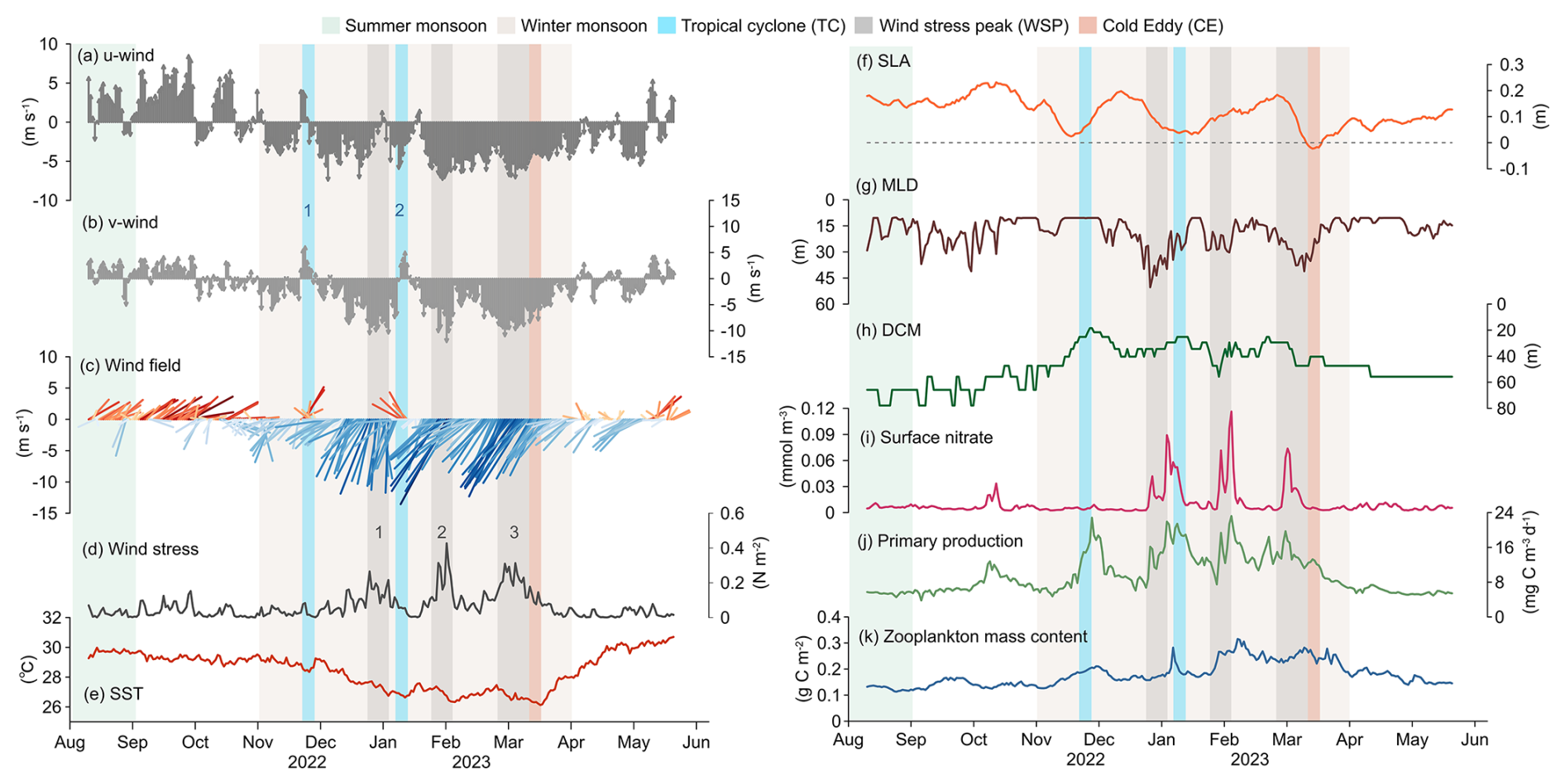 Figure 5Hydrological parameters at the sediment trap Mooring TJ-S in the southern SCS. (a) eastward component for 10 m wind (u), where positive values represent eastern winds, and negative values for western wind; (b) northward component for 10 m wind (v), where positive values represent northern winds, and negative values for southern winds; (c) sea surface wind field; (d) sea surface wind stress; (e) sea surface temperature (SST); (f) sea level anomaly (SLA); (g) mixed layer depth (MLD); (h) deep chlorophyll maximum (DCM); (i) surface nitrate; (j) net primary productivity (NPP); (k) zooplankton mass content expressed in carbon.