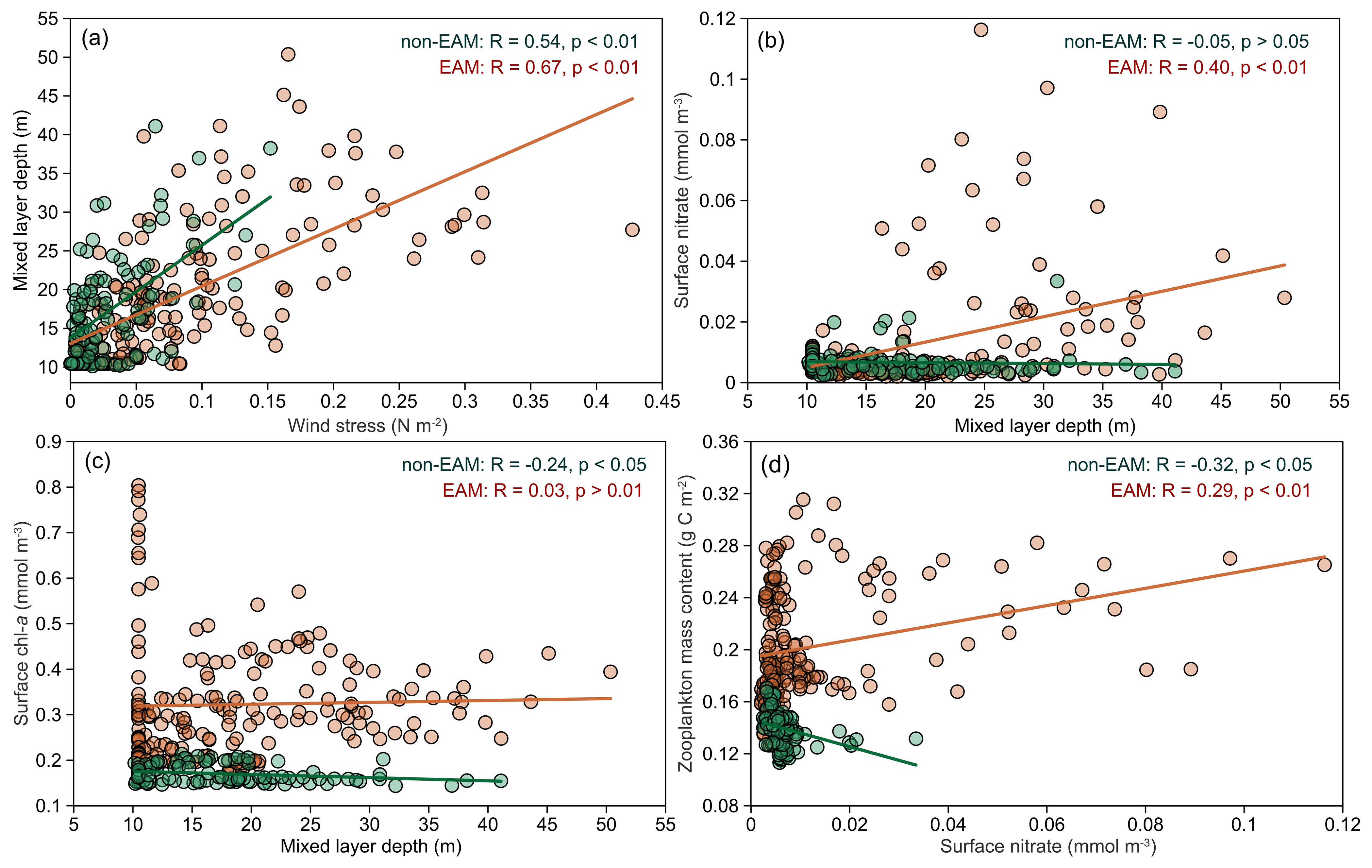 At Mooring TJ-S, this monsoon-driven mechanism was supported by correlation analysis (Fig. 6). MLD is strongly correlated with wind stress during both winter monsoon (R=0.67, p<0.01) and non-monsoon seasons (R=0.54, p<0.01, Fig. 6a). Both surface nitrate and Chl a concentration increase with deepening MLD during the EAM but show an opposite trend during non-monsoon seasons (Fig. 6b and c). Zooplankton biomass also responds positively to surface nitrate during EAM (R=0.29, p<0.01) but negatively during non-monsoon seasons (, p<0.01, Fig. 6d). These relationships highlight the key role of winter mixing in sustaining higher trophic levels and fecal pellet flux.