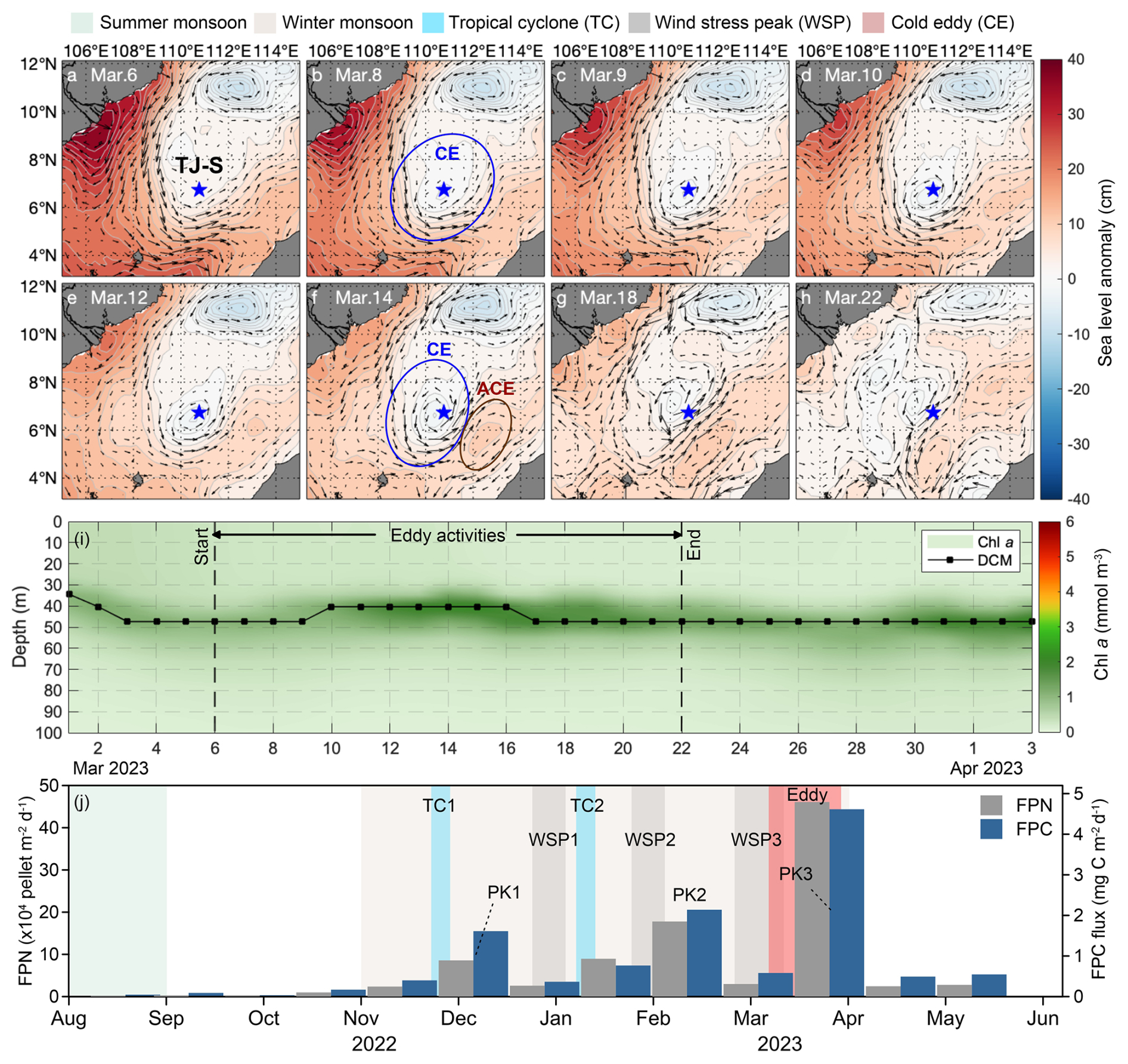 Figure 8The possible impact of mesoscale eddy activities at Mooring TJ-S. (a–h) Sea surface anomaly and current field from 6-22 March 2023. The blue star represents the location of TJ-S. (i) Chl a concentration and DCM during eddy activity. (j) FPN and FPC fluxes.