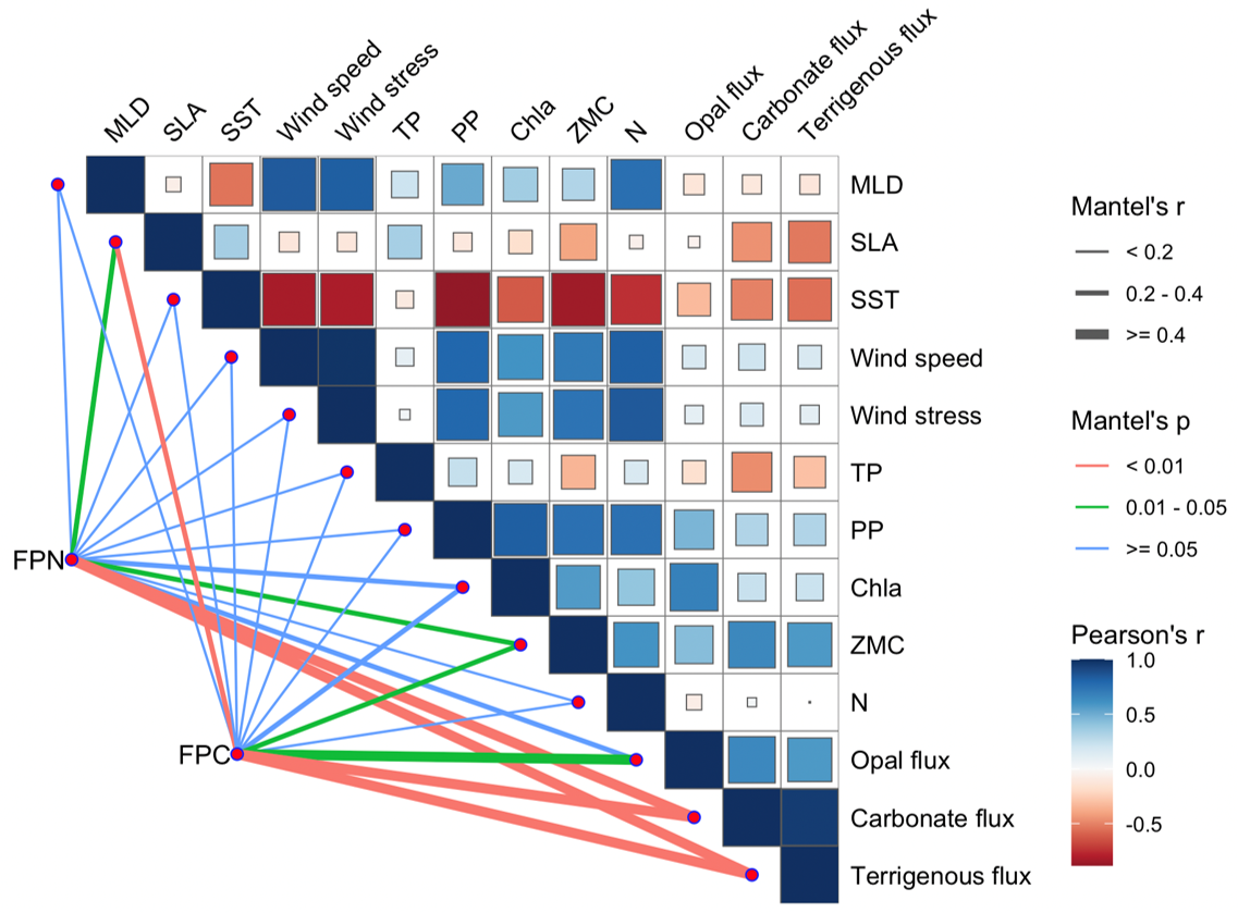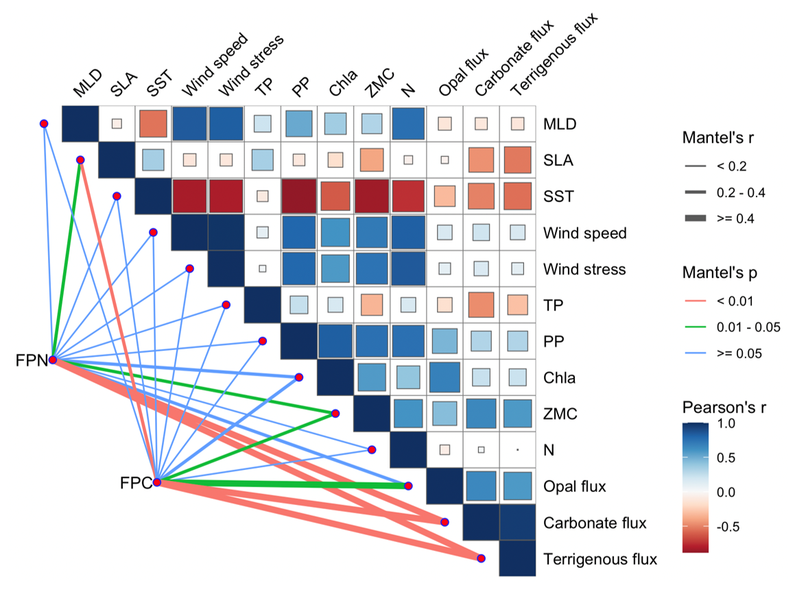 The strong correlations revealed by the Mantel test (Fig. 9) highlight the close coupling between fecal pellet export and regional upper-ocean dynamics. The significant relationships of both FPN and FPC with sea level anomaly (SLA) and zooplankton biomass (ZMC) suggest the primary regulation of zooplankton productivity and key impacts of eddy activities (p<0.05). Positive associations with other mass components, including carbonate, silica, and terrigenous fluxes (p<0.01) further indicate the importance of aggregation and mineral ballasting in facilitating fecal pellet export during high-flux events. Collectively, these correlations imply that different components of POC tend to increase proportionally during periods of intensified pellet export, driven by episodic events such as monsoon and eddy activities.