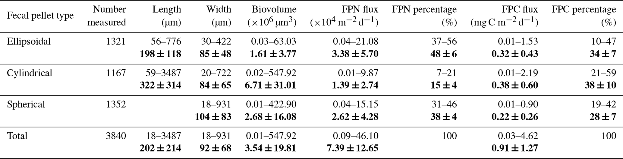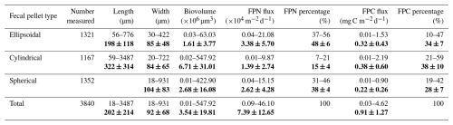 Three types of zooplankton fecal pellets were identified at Mooring TJ-S: spherical, cylindrical, and ellipsoidal (Fig. 2a). Most pellets exhibited compact structures with distinct edges and colors ranging from light green to dark brown. Larger pellets were typically darker, while smaller ones appeared more transparent (Fig. 2b). Geometric and flux characteristics are summarized in Table 1 and Fig. 3, with detailed data in Table S1 in the Supplement. Cylindrical pellets were the largest, with mean biovolumes (6.71×105 µm3) about 2–4 times those of ellipsoidal (1.61×105 µm3) and spherical (2.68×105 µm3) pellets (p<0.001). Spherical pellets were also larger than ellipsoidal pellets (p<0.05). Considerable size variability occurred with types, particularly cylindrical pellets, which range in length from over 1 mm and width from more than 400 µm for larger specimens to less than 50 µm in width for smaller specimens (Table 1; Figs. S7 and S8 in the Supplement).