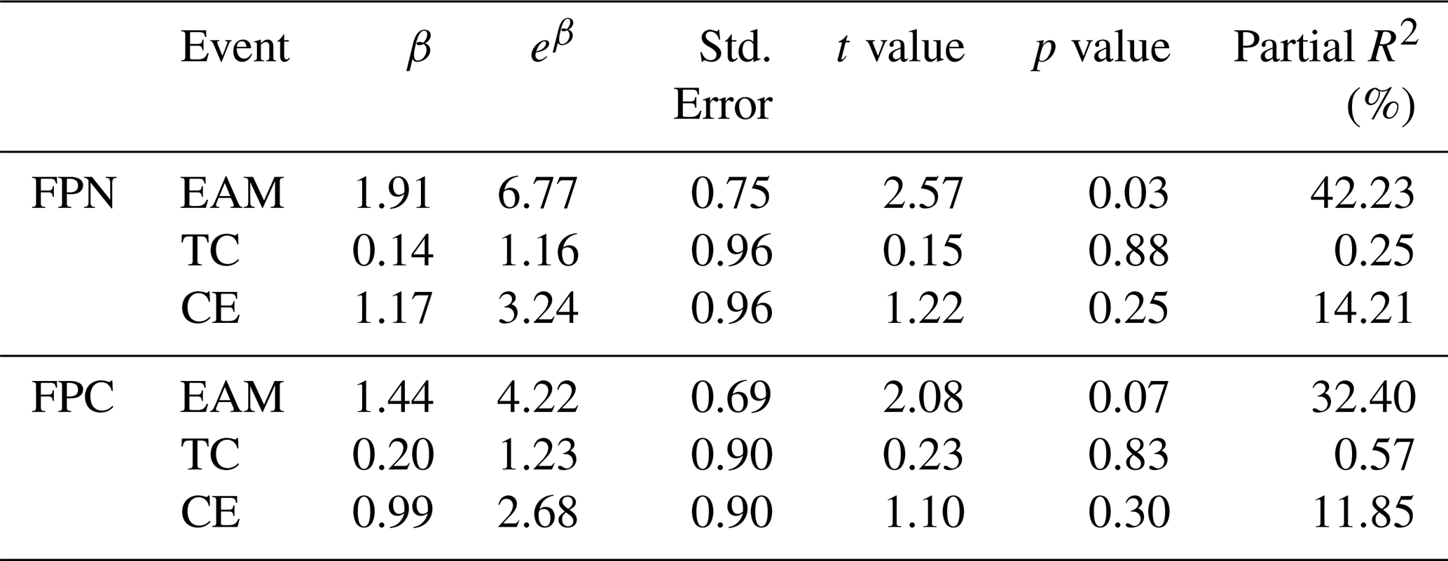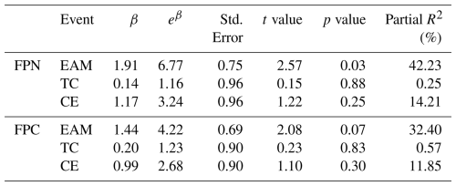 Table 2Summary of GLM results showing the effects of three dynamic events, EAM, TC and cyclonic eddy (CE) on fecal pellet flux (FPN, FPC). Estimates (β) represent the fitted coefficients of log-transformed fluxes. Partial R2 values were calculated using the formula to quantify the independent contribution of each event.