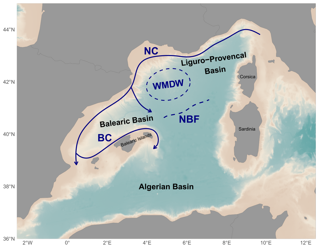 Figure 1Maps of the NWMS showing the major oceanographic currents and front (NC: Northern Current, BC: Balearic Current, NBF: North Balearic Front, WMDW: Western Mediterranean Deep Water formation area) of the northern part of the NWMS. After Millot (1987), López García et al. (1994), Pinardi and Masetti (2000).