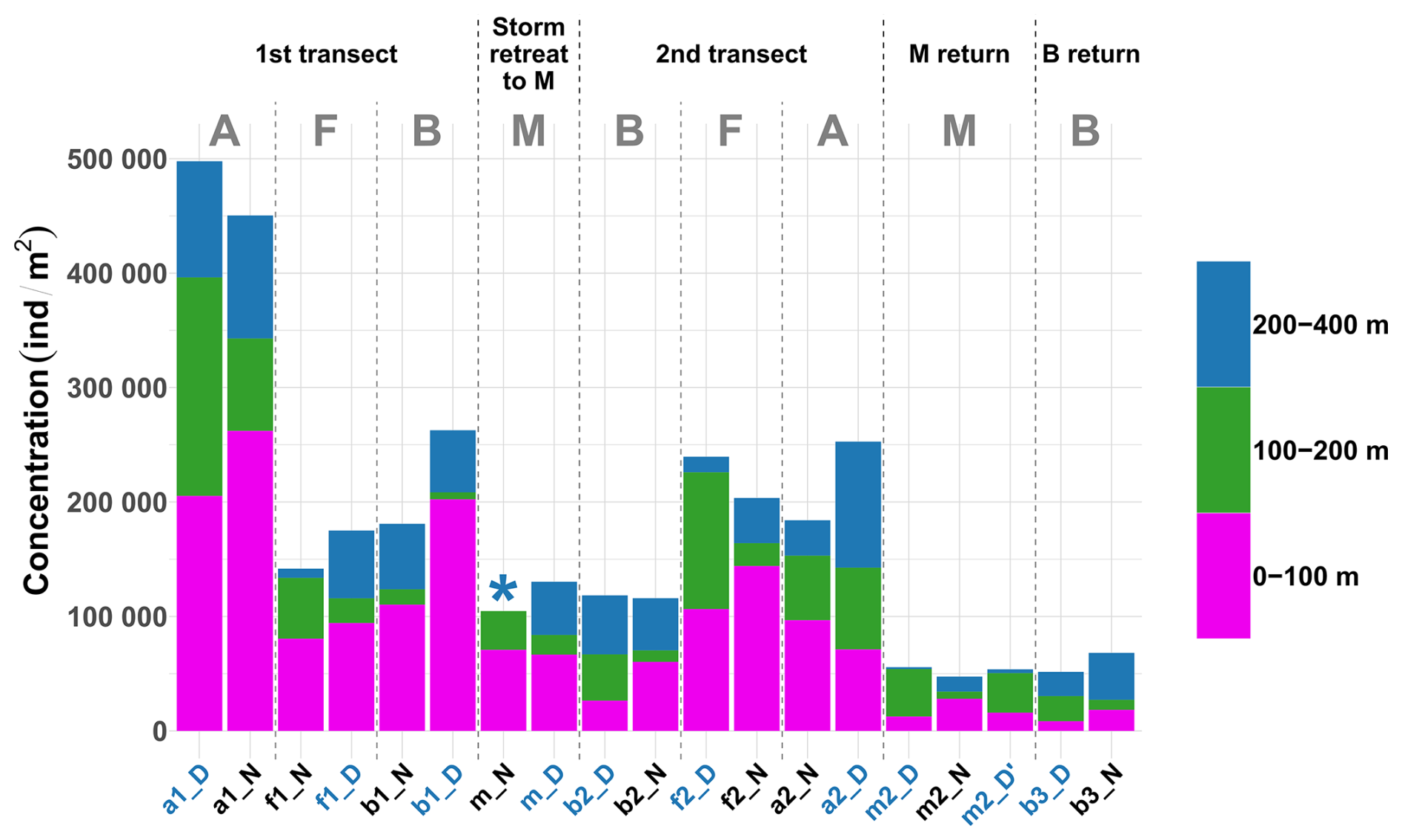 Figure 3Stacked bar plot showing the concentration of zooplankton by reconstructed layer and across all sampled stations. Stations are in chronological order. The asterisk (*) indicates that the 200–400 m net at station mN could not be analyzed. Station name colors indicate the period of the day (blue: midday; black: midnight). Letters A, B, F, and M denote water masses.