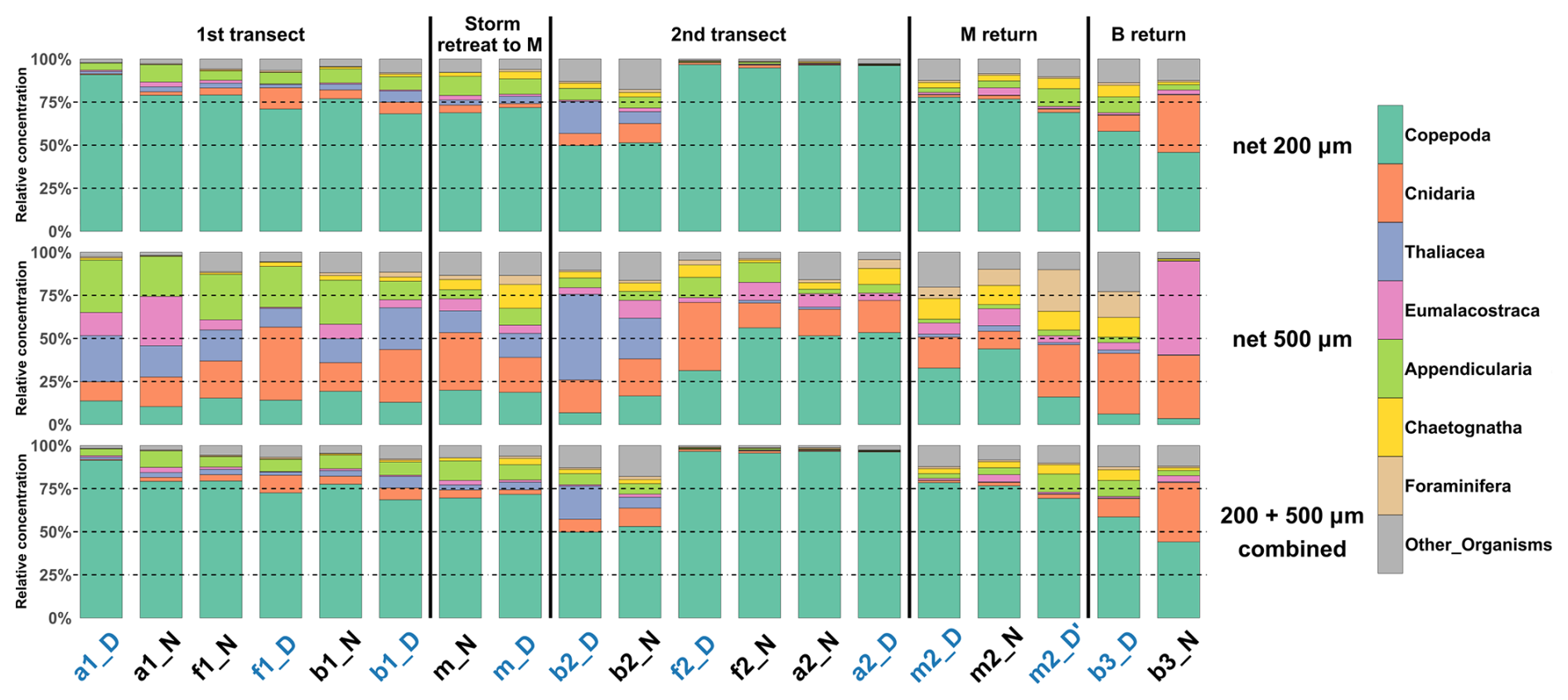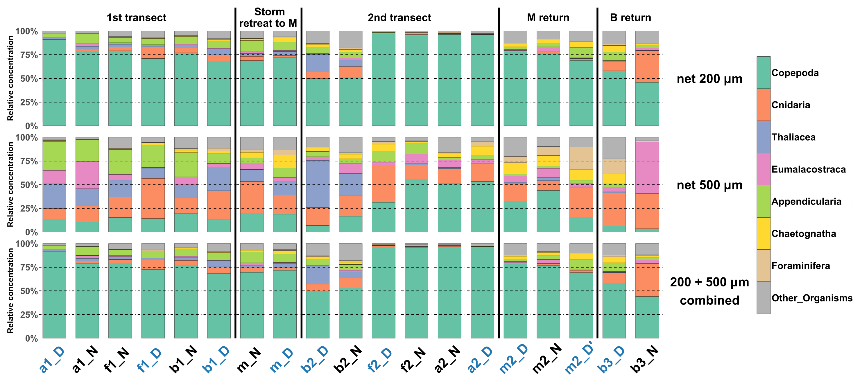 Figure 4Relative concentration of taxonomic groups for nets deployed from the surface to a depth of 200 m, for the two mesh sizes (200 µm top, and 500 µm, middle) across all sampled stations (chronological order). Bottom: Relative concentration combining the two mesh sizes. Station name colors indicate the period of the day (blue: midday; black: midnight).