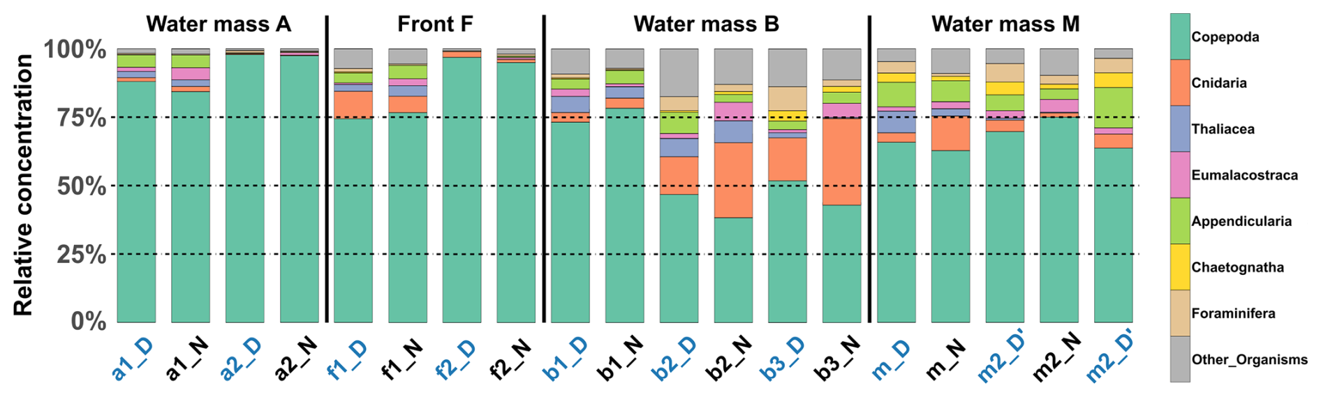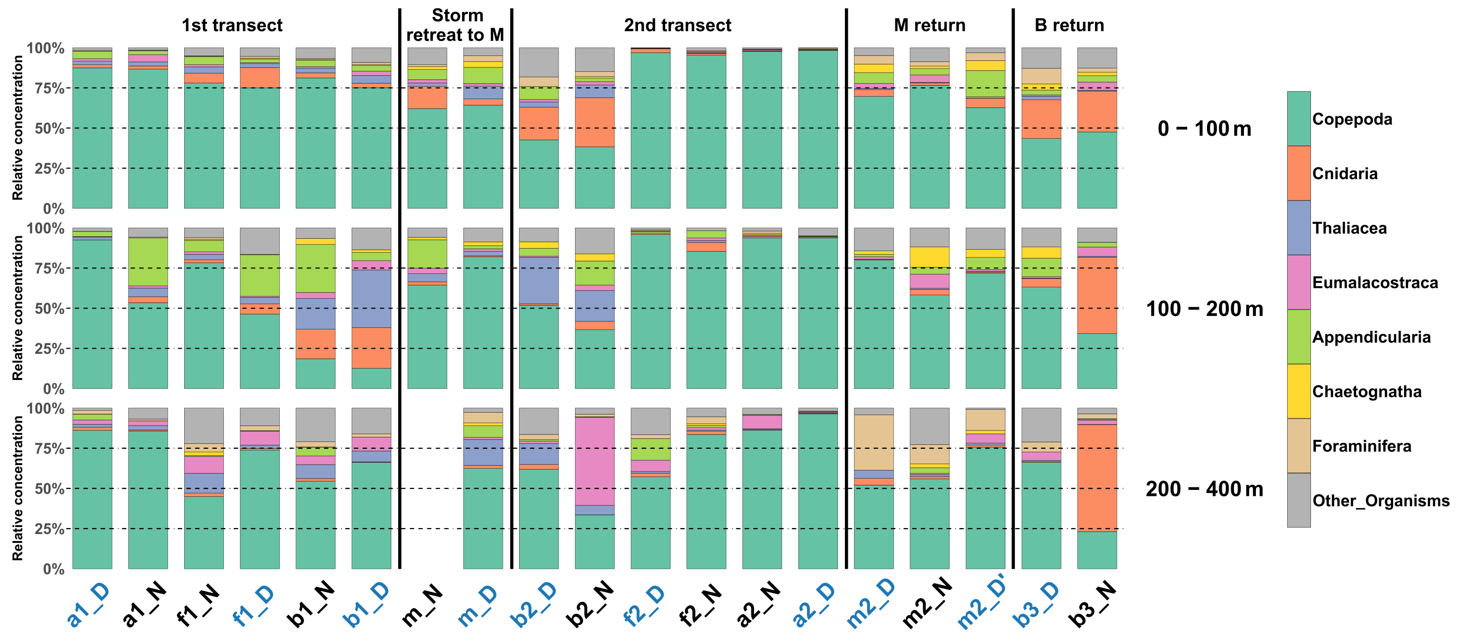 Figure 5Relative concentration of taxonomic groups for the combined nets for the three reconstructed layers across all sampled stations (chronological order). The 200–400 m net at station mN could not be analyzed. Station name colors indicate the period of the day (blue: midday; black: midnight).