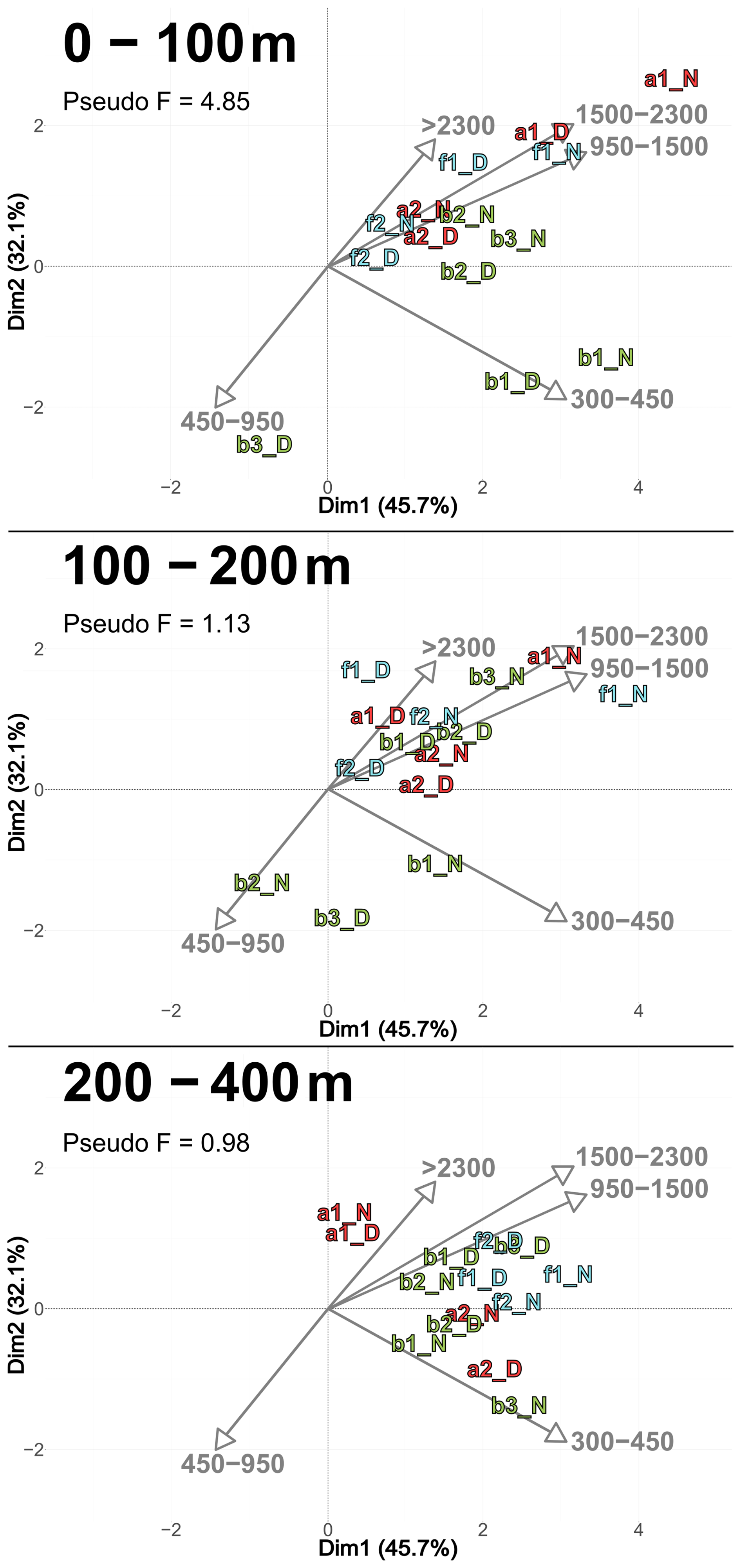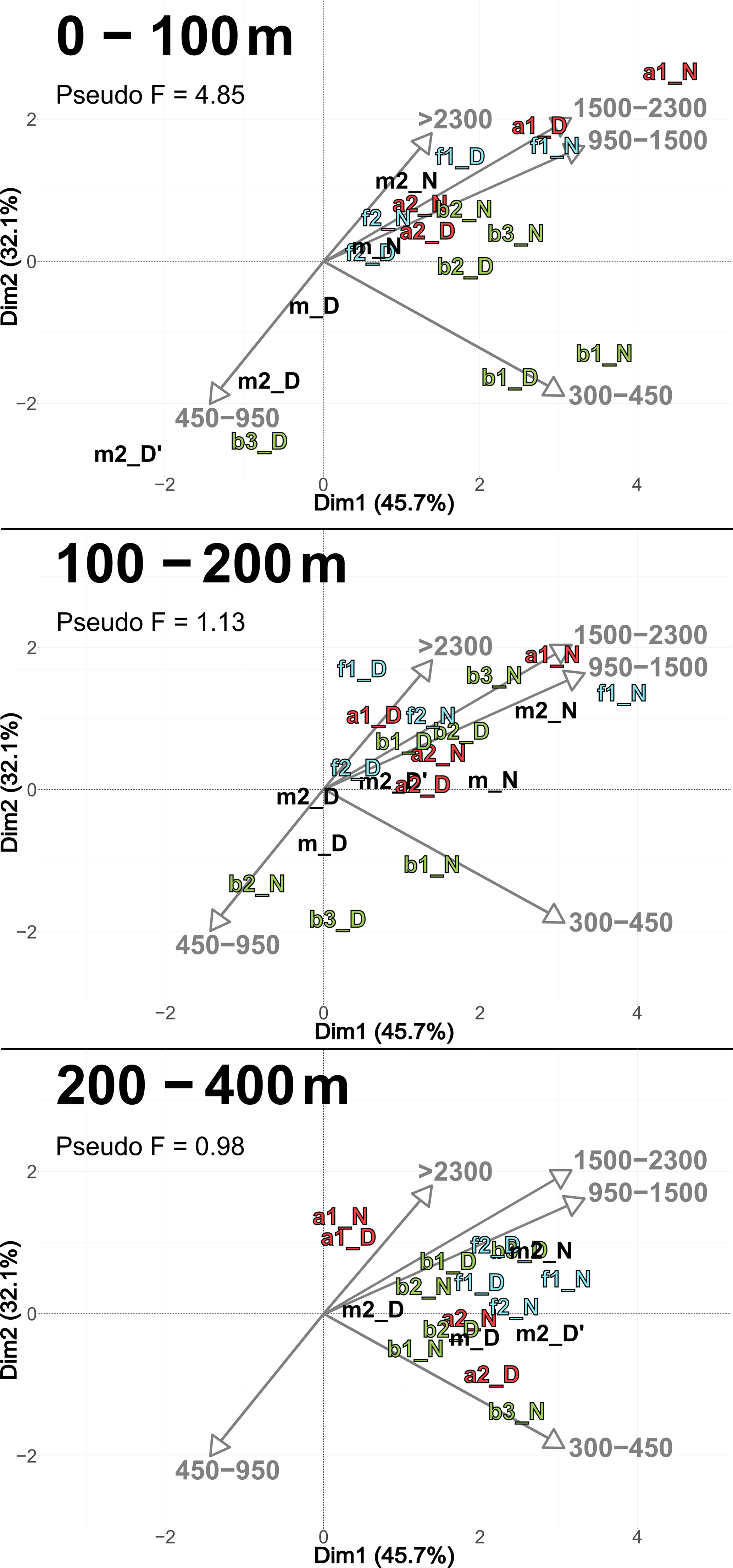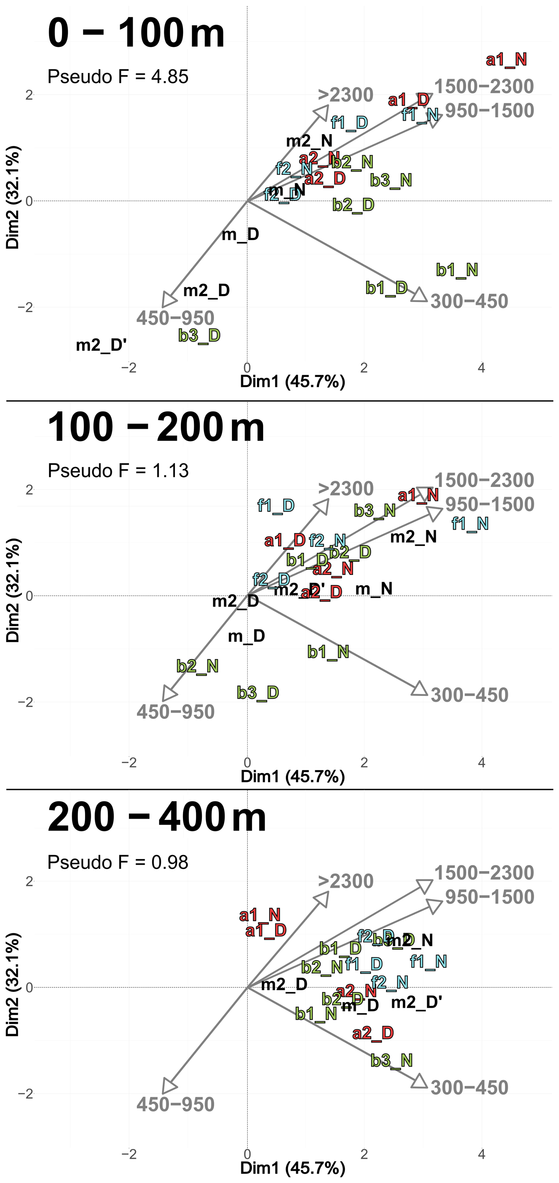 Figure 6PCACommunity illustrating the composition of communities, based on relative concentration data (Hellinger transformation) from all stations for each reconstructed layer. The axis computed for 0–400 m were used for the three layers. Colors refer to the water mass (red for A, green for B, cyan for F and violet for M). In 0–100 m: stations a2N and f2D overlap at dim1 =2.3 and dim2 =0.3. In 100–200 m: stations a2D and 2D overlap at dim1 =2 and dim2 =0.1; f1N and b1D overlap at dim1 = 1.9 and dim2 =1.8. In 200–400 m: stations a1D and a2N overlap at dim1 =1.8 and dim2 = 0.3.