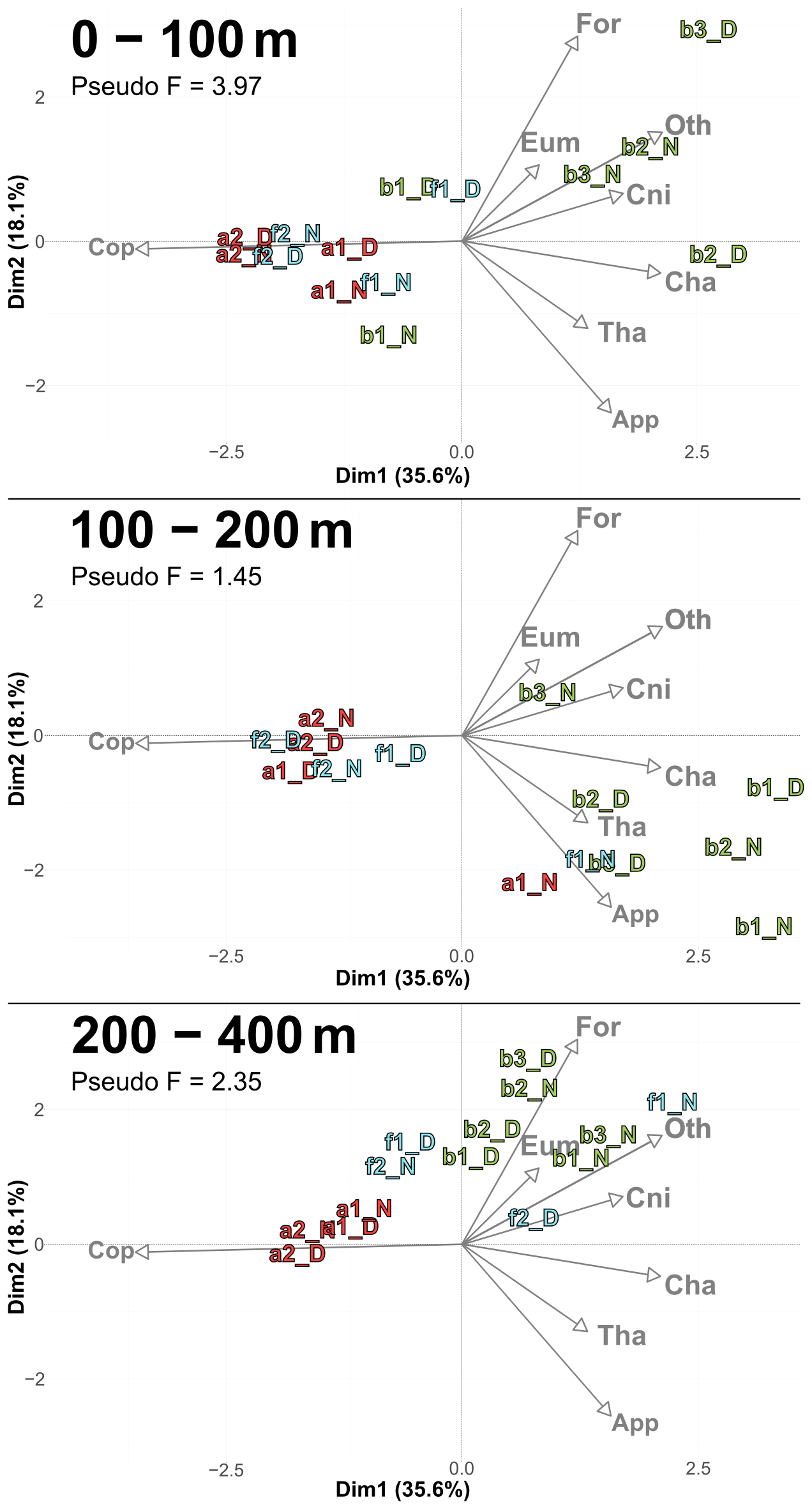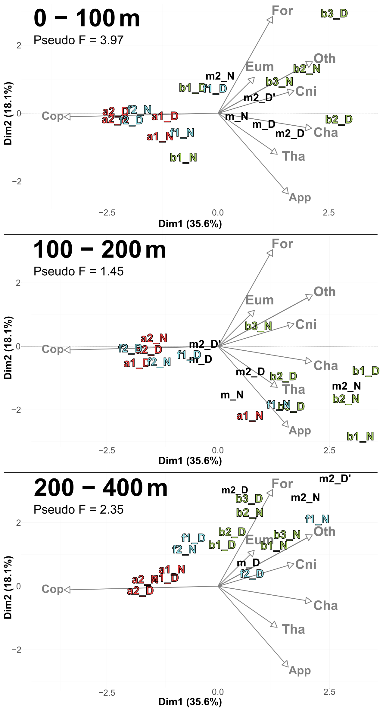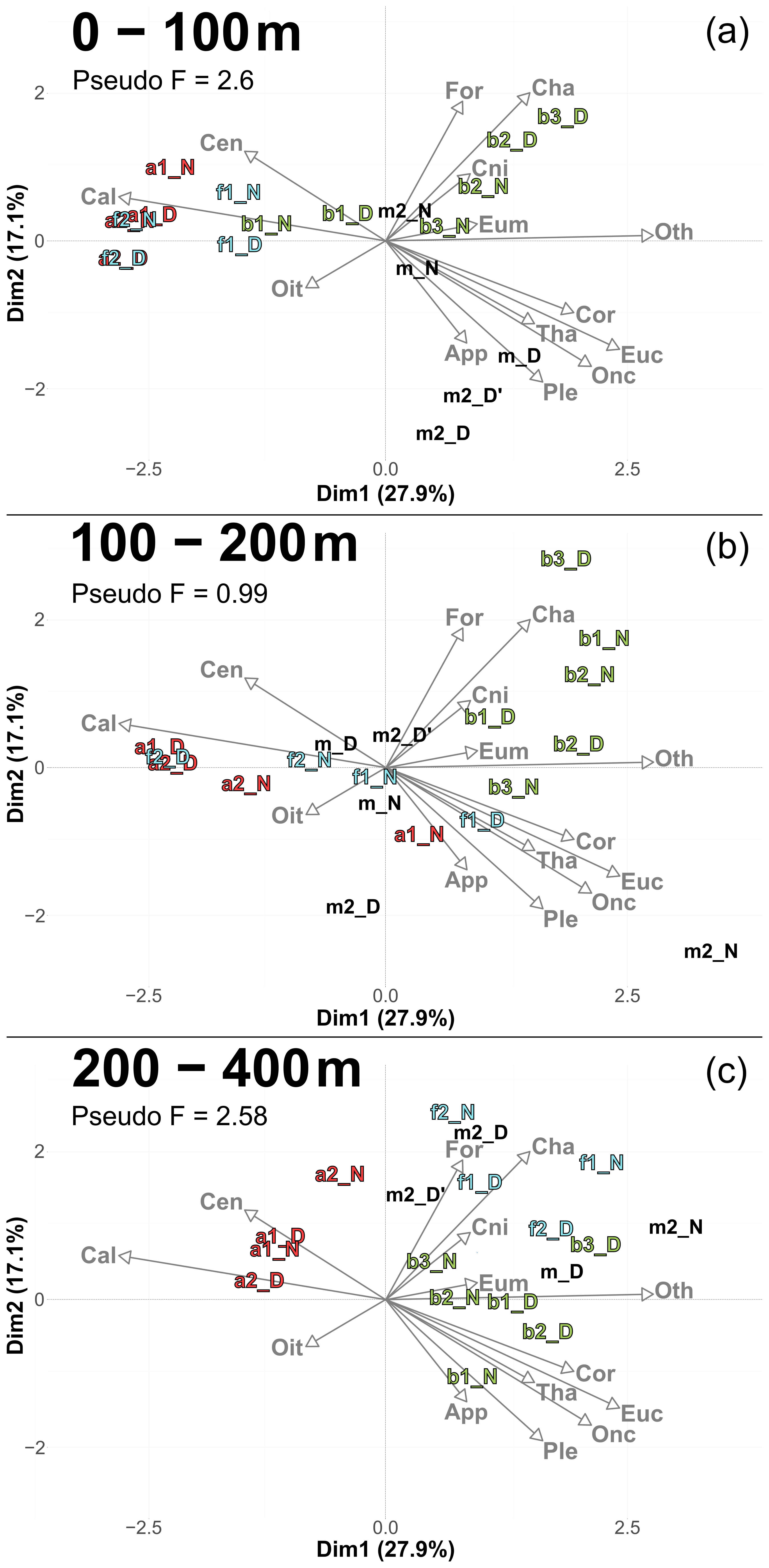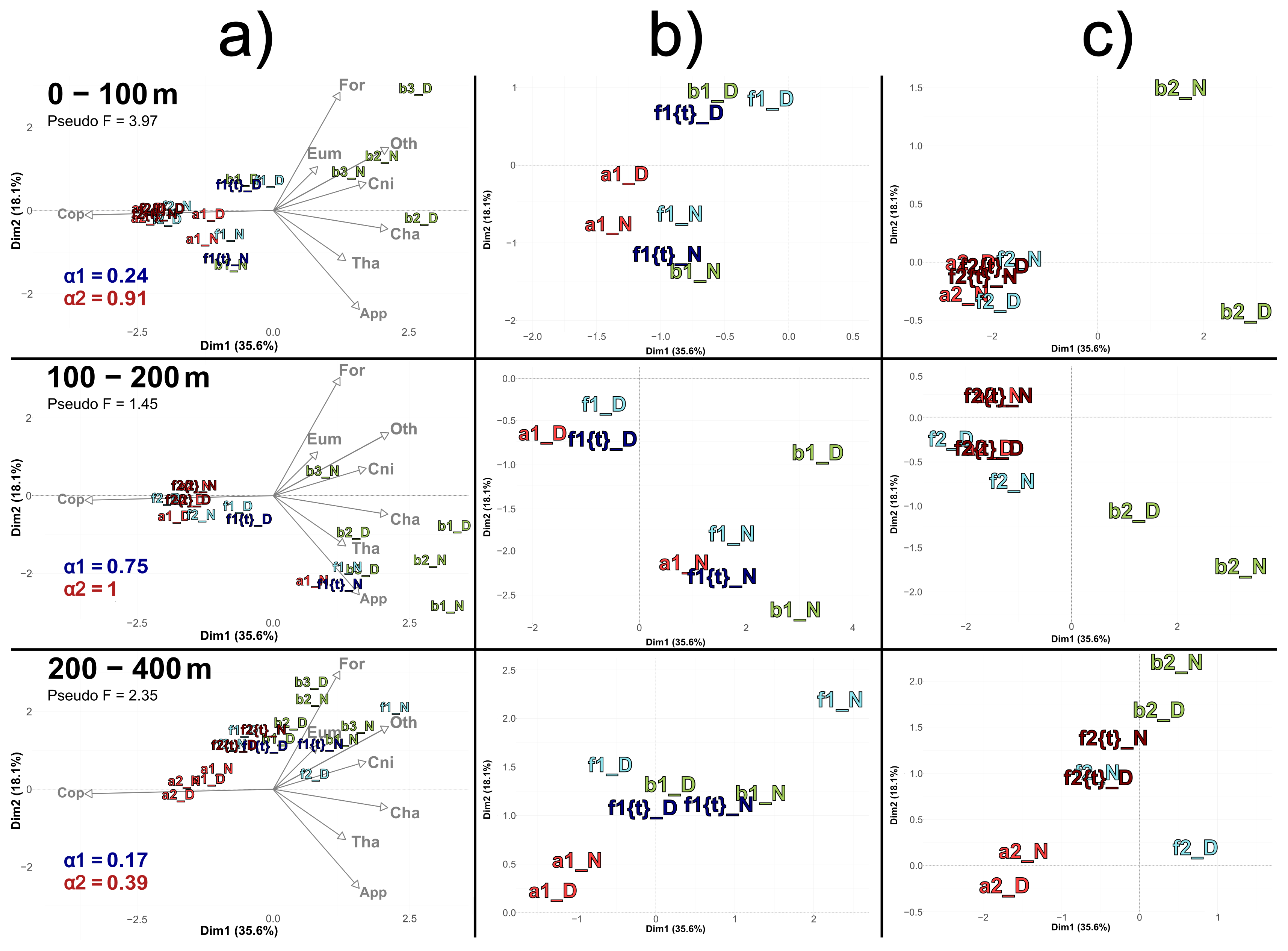 Figure 6PCACommunity illustrating the composition of communities, based on relative concentration data (Hellinger transformation) from all stations for each reconstructed layer. The axis computed for 0–400 m were used for the three layers. Colors refer to the water mass (red for A, green for B, cyan for F and violet for M). In 0–100 m: stations a2N and f2D overlap at dim1 =2.3 and dim2 =0.3. In 100–200 m: stations a2D and 2D overlap at dim1 =2 and dim2 =0.1; f1N and b1D overlap at dim1 = 1.9 and dim2 =1.8. In 200–400 m: stations a1D and a2N overlap at dim1 =1.8 and dim2 = 0.3.